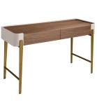 To biurko stanowi harmonijne połączenie ciepła drewna i wyrafinowanego połysku metalu. Ciemny, orzechowy blat zdobi delikatnie uniesiona krawędź w kremowym