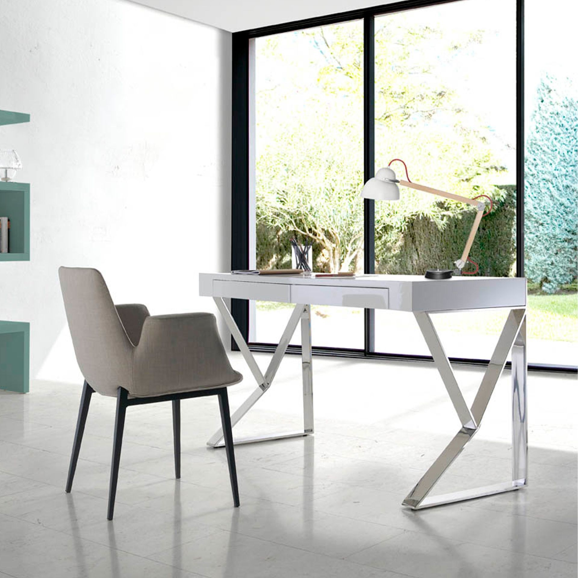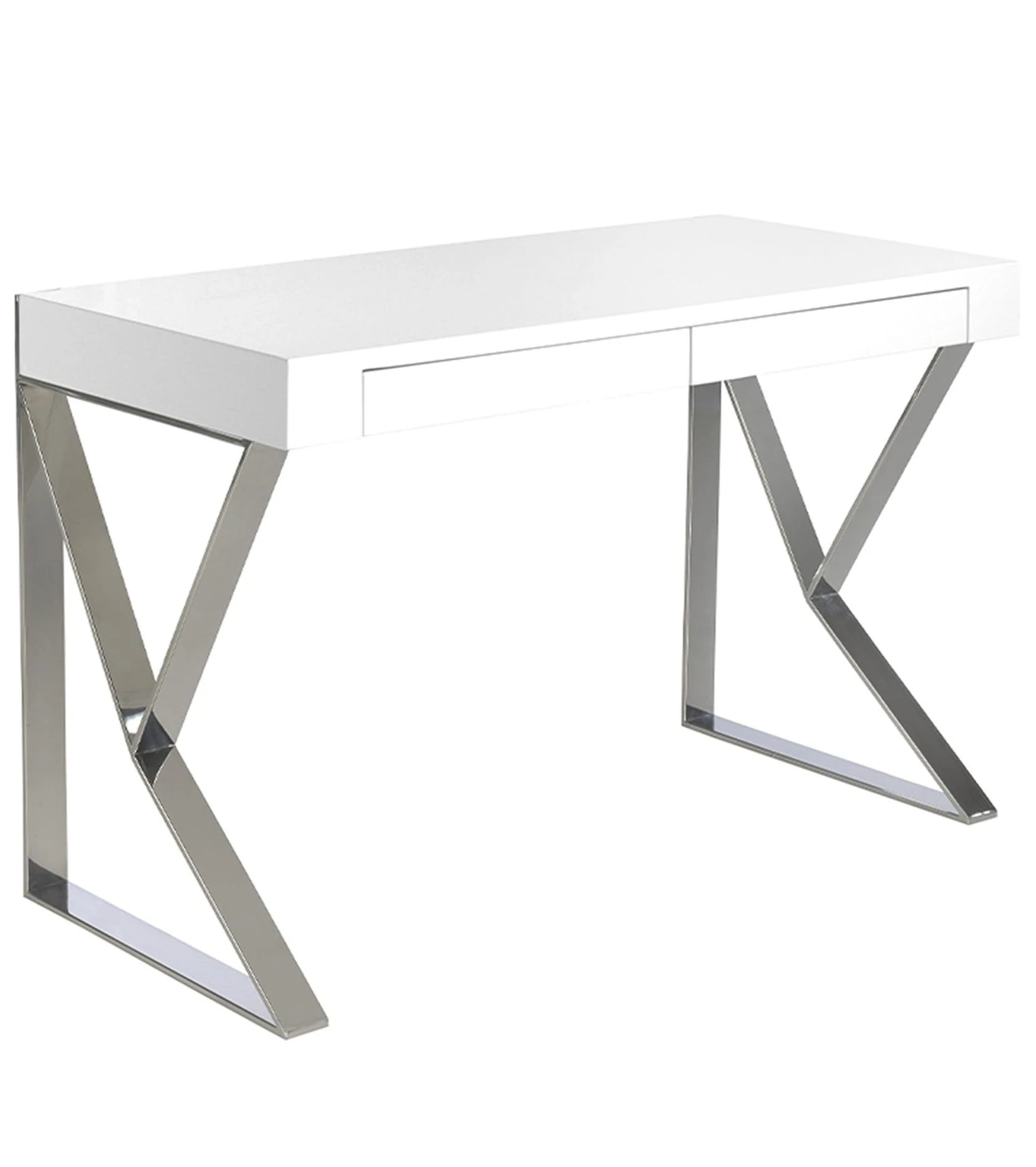 Biurko o nowoczesnym designie wykonane z białego drewna MDF. Konstrukcja chromowanych nóg ze stali nierdzewnej wniesie wyrafinowany i ekskluzywny charakter do Twojego