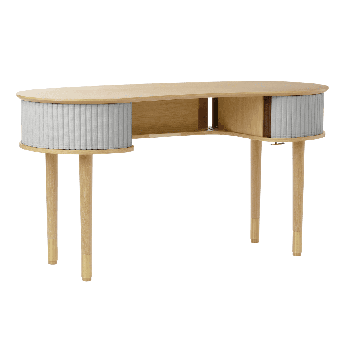 Biurko Audacious to przykład ponadczasowego wzornictwa, które harmonijnie łączy funkcjonalność z elegancją. Jego zaokrąglona, organiczna bryła przywodzi na myśl nordycką prostotę, a przesuwane materiałowe drzwi żaluzjowe dodają projektowi subtelnej nostalgii, tworząc łagodne przejście między tradycją a nowoczesnością. Przemyślane detale sprawiają, że codzienna praca staje się bardziej komfortowa i uporządkowana. Dyskretny haczyk na słuchawki ukryty pod blatem ułatwia organizację, a tylny panel sprytnie maskuje wszystkie kable, pozostawiając przestrzeń w nienagannym ładzie. Wbudowane przegródki pomagają utrzymać akcesoria zawsze pod ręką, a regulowane nogi pozwalają dopasować wysokość mebla do indywidualnych potrzeb. Drzwi żaluzjowe można z łatwością wymieniać, nadając biurku nowy charakter bez konieczności zakupu kolejnego mebla. To rozwiązanie sprzyja zarówno estetycznej odnowie, jak i świadomemu podejściu do użytkowania zasobów, wydłużając żywotność produktu i czyniąc go jeszcze bardziej przyjaznym dla środowiska.