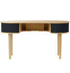 Biurko Audacious to przykład ponadczasowego wzornictwa, które harmonijnie łączy funkcjonalność z elegancją. Jego zaokrąglona, organiczna bryła przywodzi na myśl nordycką prostotę, a przesuwane materiałowe drzwi żaluzjowe dodają projektowi subtelnej nostalgii, tworząc łagodne przejście między tradycją a nowoczesnością. Przemyślane detale sprawiają, że codzienna praca staje się bardziej komfortowa i uporządkowana. Dyskretny haczyk na słuchawki ukryty pod blatem ułatwia organizację, a tylny panel sprytnie maskuje wszystkie kable, pozostawiając przestrzeń w nienagannym ładzie. Wbudowane przegródki pomagają utrzymać akcesoria zawsze pod ręką, a regulowane nogi pozwalają dopasować wysokość mebla do indywidualnych potrzeb. Drzwi żaluzjowe można z łatwością wymieniać, nadając biurku nowy charakter bez konieczności zakupu kolejnego mebla. To rozwiązanie sprzyja zarówno estetycznej odnowie, jak i świadomemu podejściu do użytkowania zasobów, wydłużając żywotność produktu i czyniąc go jeszcze bardziej przyjaznym dla środowiska.