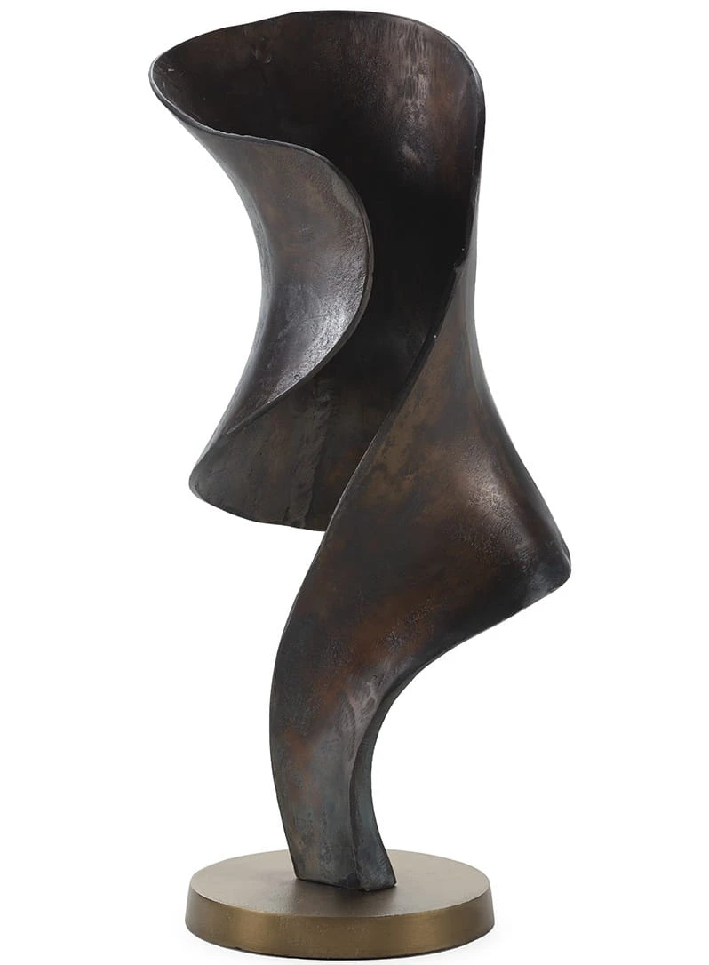 Zakrzywiona niczym tchnienie wiatru forma zdaje się tańczyć w przestrzeni, łącząc ciężar metalu z lekkością ruchu. Powierzchnia, pełna niuansów i refleksów, opowiada historię o czasie, ogniu i dotyku ludzkiej ręki. To dzieło, które wymyka się jednoznacznym kategoriom — pomiędzy abstrakcją a naturą, surowością a poezją. W każdym załamaniu światło i cień prowadzą cichy dialog, wydobywając z kształtu emocję i rytm. Rzeźba emanuje spokojem, a zarazem dynamiką, jakby uchwyciła chwilę tuż przed ruchem — moment zawieszenia, który wypełnia wnętrze subtelną energią. To obiekt, który nie tylko zdobi, ale też wciąga w refleksję o formie, materii i przestrzeni.