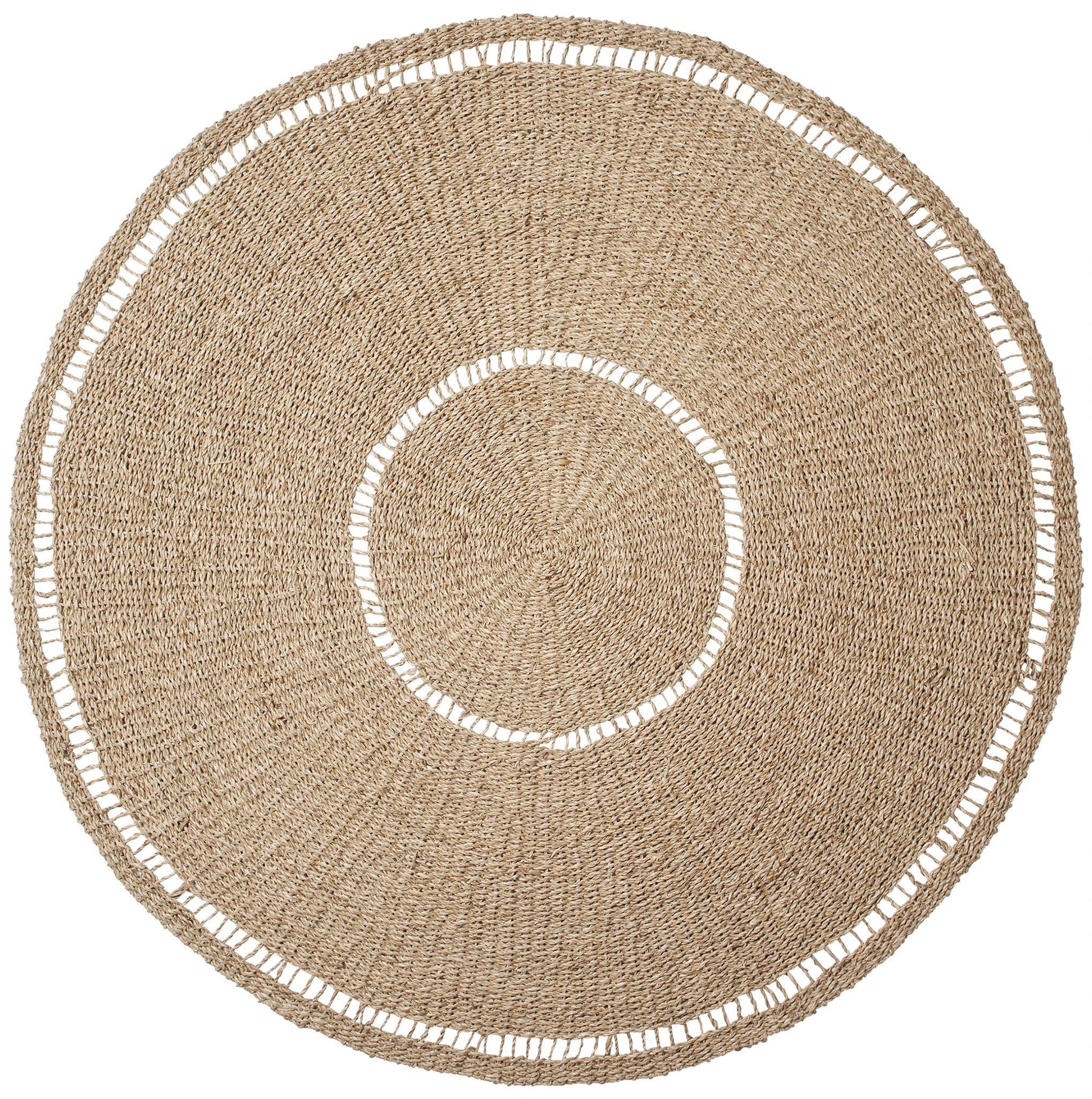 Okrągły, ręcznie tkany dywan z trawy morskiej. Obramowanie inspirowane koronką nadaje dywanowi niepowtarzalny wyraz. Idealnie nadaje się do udekorowania przestrzeni w salonie i wykorzystania