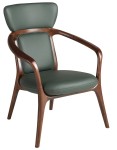 Subtelna forma, w której drewno i miękka linia spotykają się w harmonijnym geście. Krzesło zachwyca płynną, rzeźbiarską konstrukcją z drewna w ciepłym odcieniu orzecha, którego naturalny rysunek podkreśla elegancję i ponadczasowy charakter mebla. Oparcie i podłokietniki tworzą jedną, delikatnie opływową ramę – lekką wizualnie, a jednocześnie stabilną i przyjemną w użytkowaniu. Siedzisko oraz oparcie wypełnia miękka tapicerka z ekologicznej skóry w stonowanym, zielonkawym odcieniu. Materiał jest przyjemny w dotyku, a jego gładka powierzchnia pięknie kontrastuje z ciepłem naturalnego drewna. Starannie poprowadzone przeszycia podkreślają dopracowane detale i nadają całości eleganckiego wykończenia. To krzesło doskonale odnajdzie się zarówno przy stole jadalnianym, jak i w eleganckim gabinecie czy salonie. Łączy komfort z wyrafinowaną formą, wprowadzając do wnętrza spokojną elegancję i naturalne ciepło.