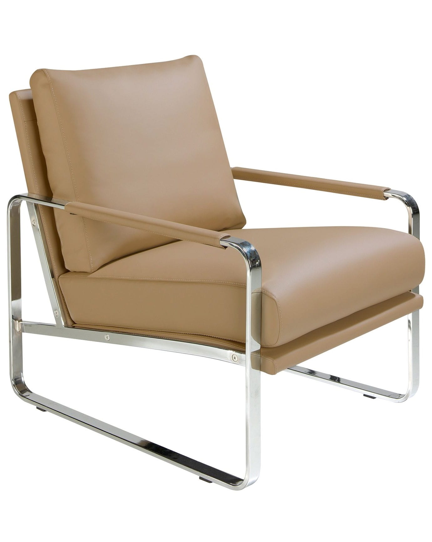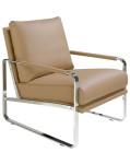 Fotel z podłokietnikami o nowoczesnym designie, z siedziskiem i oparciem obitym skórą ekologiczną. Zarówno ze względu na swój styl, jak i nogi z chromowanej stali nierdzewnej,