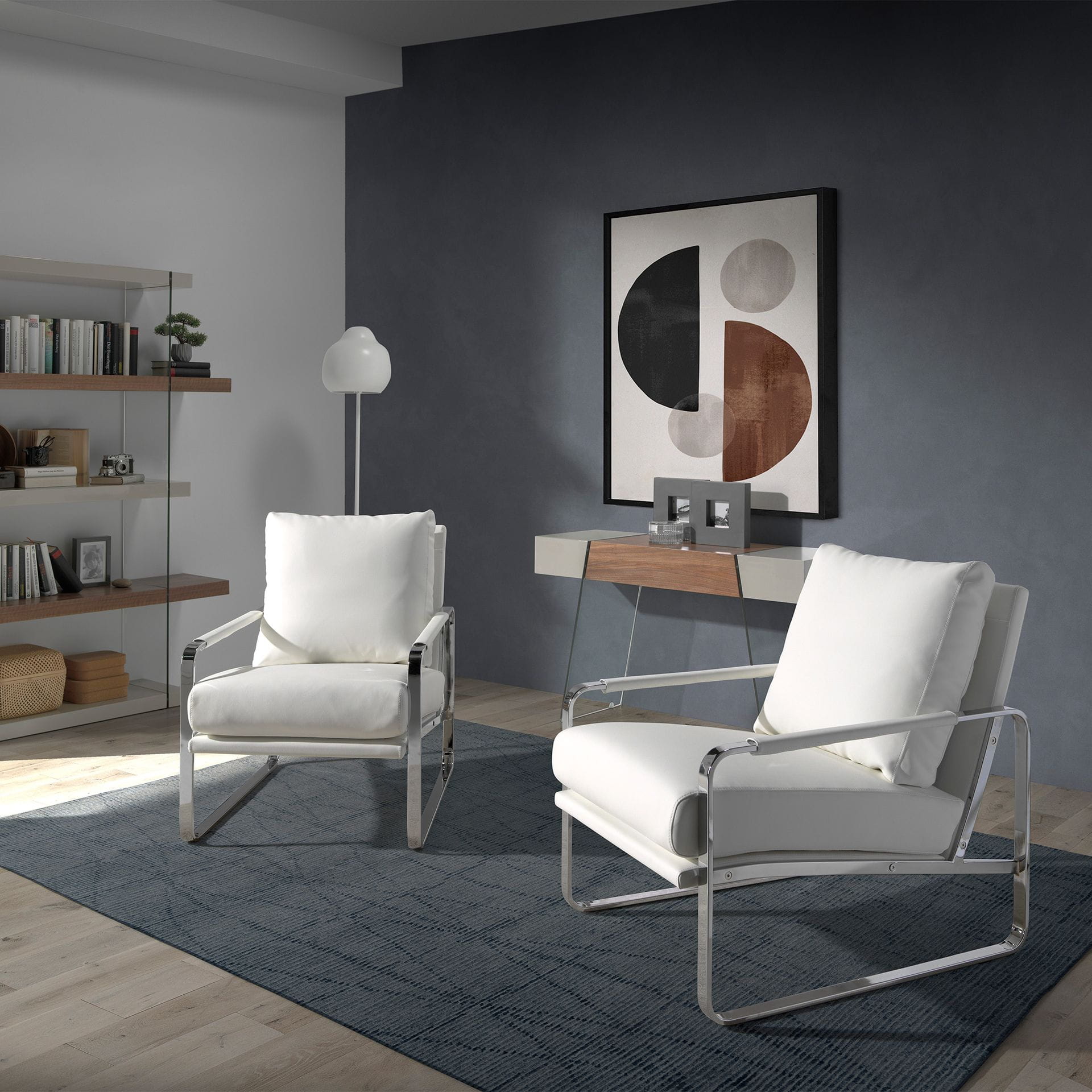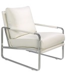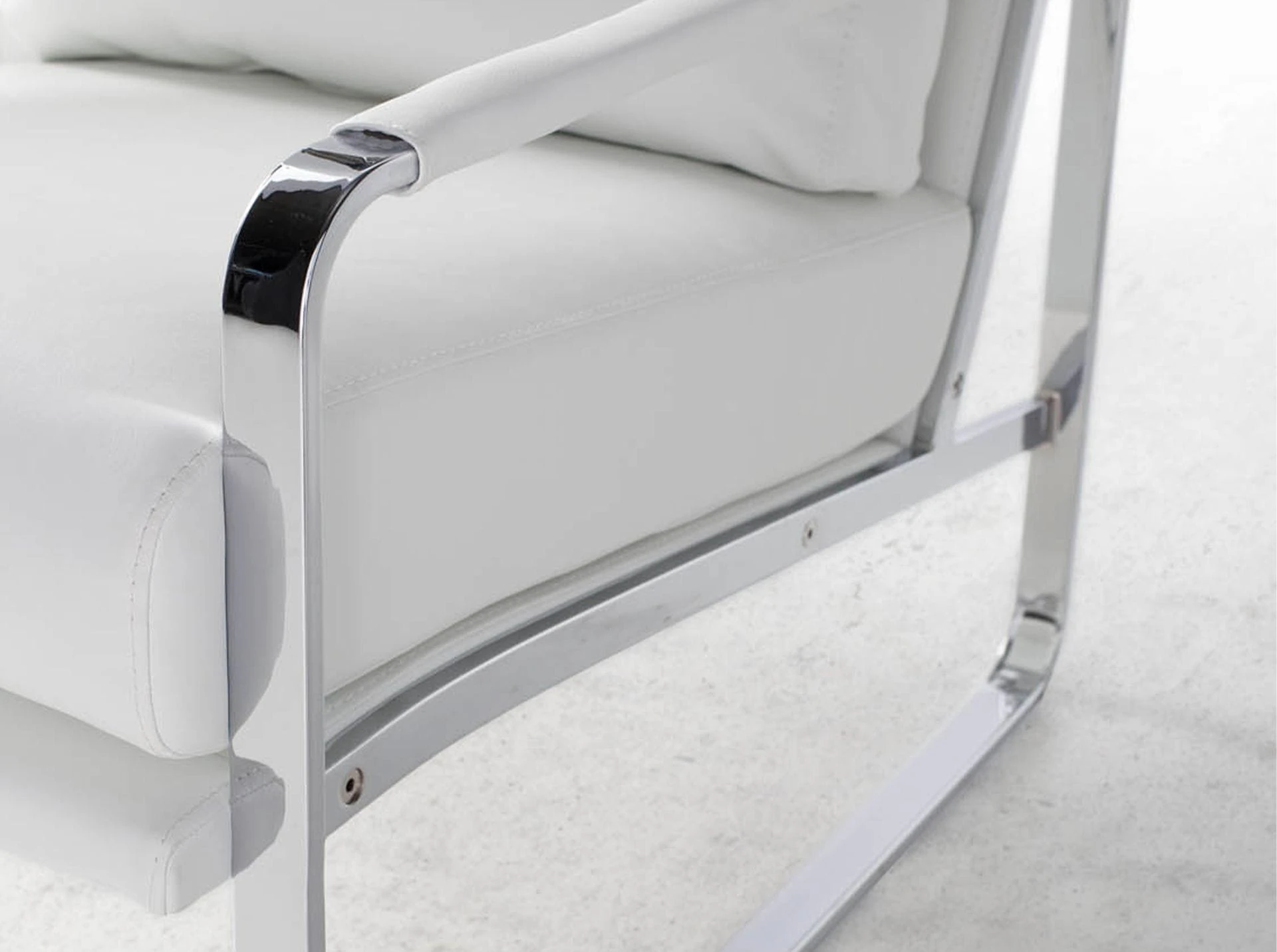 Fotel z podłokietnikami o nowoczesnym designie, z siedziskiem i oparciem obitym skórą ekologiczną. Zarówno ze względu na swój styl, jak i nogi z chromowanej stali nierdzewnej,