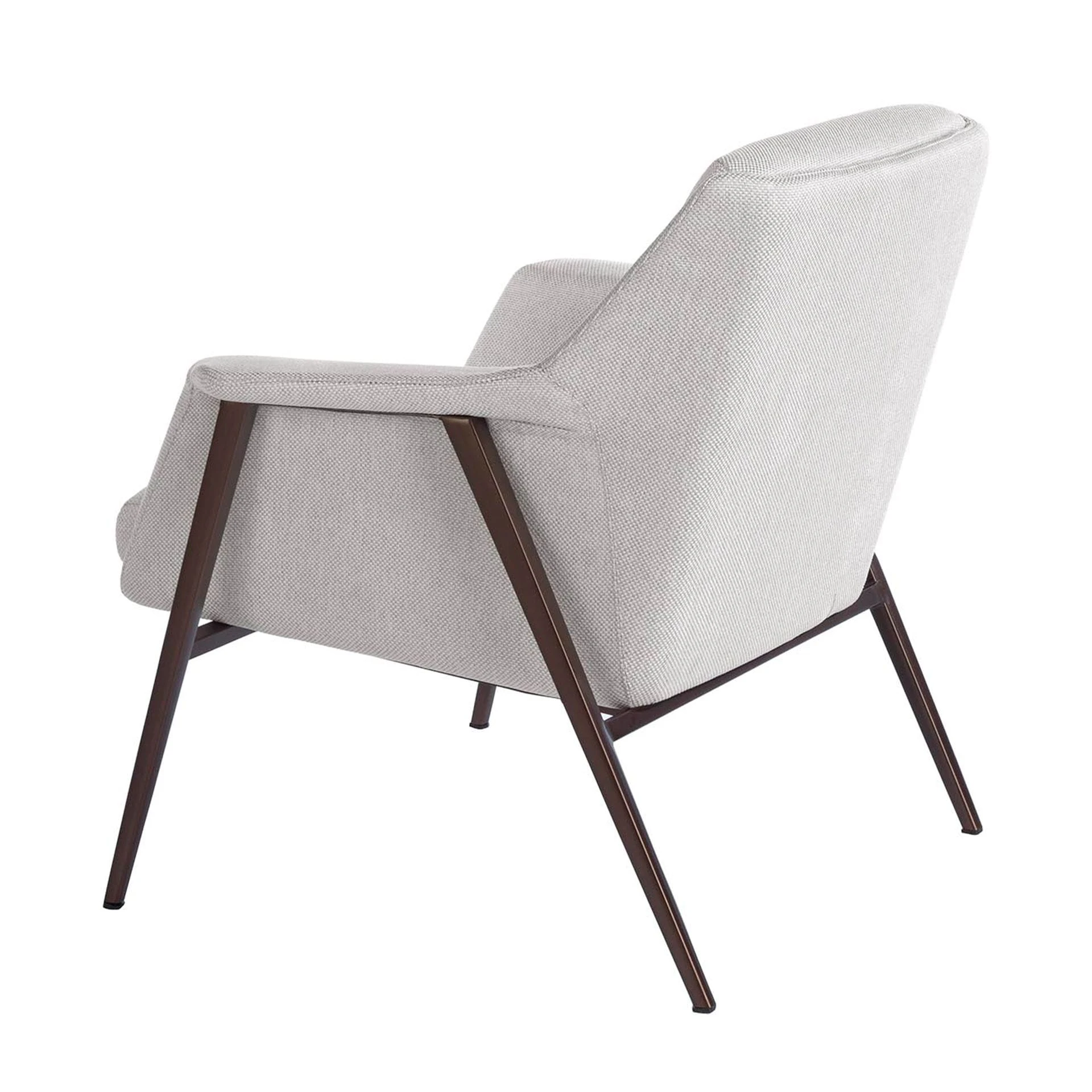 Fotel z nowoczesnymi podłokietnikami z siedziskiem i oparciem tapicerowanym białą-szarną tkaniną. Zarówno ze względu na styl, jak i brązowe, malowane stalowe nogi, ten fotel