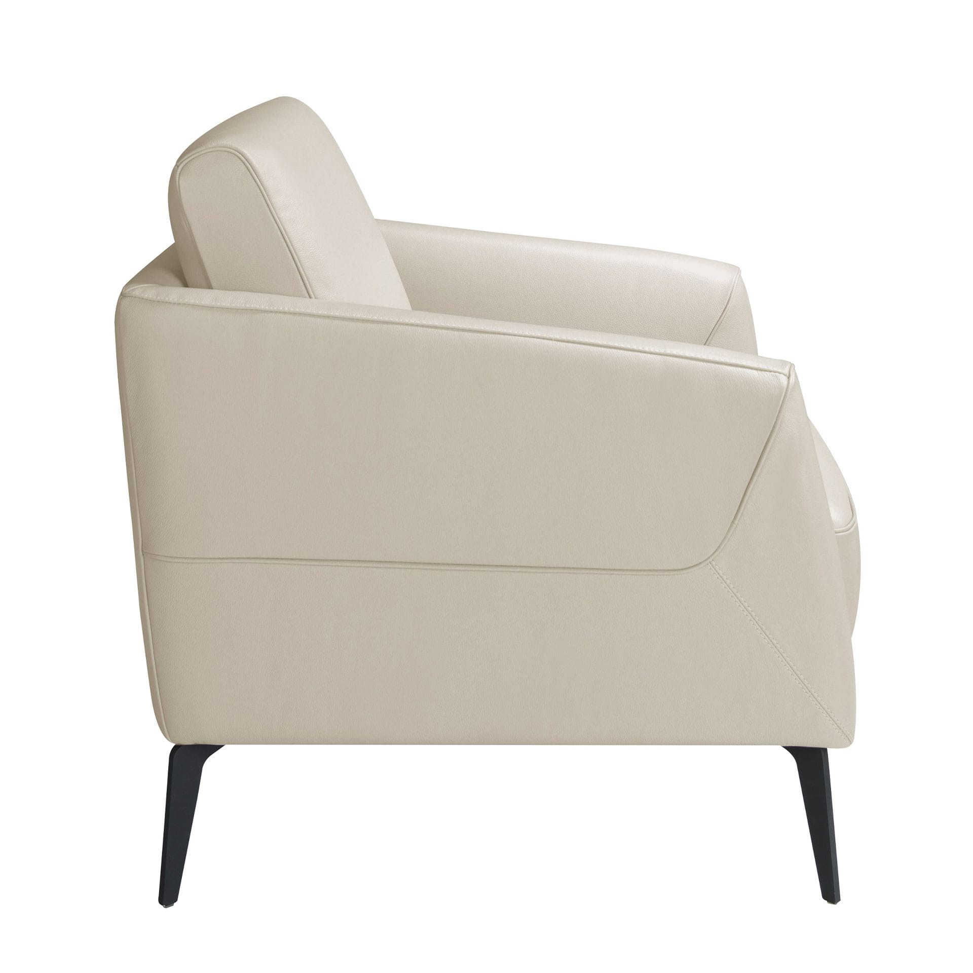 Fotel z nowoczesnymi podłokietnikami z siedziskiem i oparciem tapicerowanym perłowo-szarą skórą bydlęcą. Zarówno ze względu na styl, jak i czarne, malowane żywicą