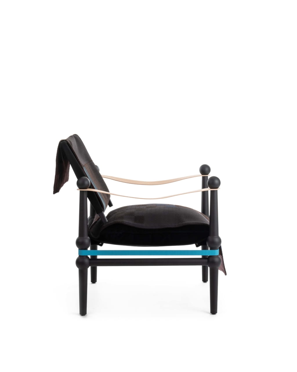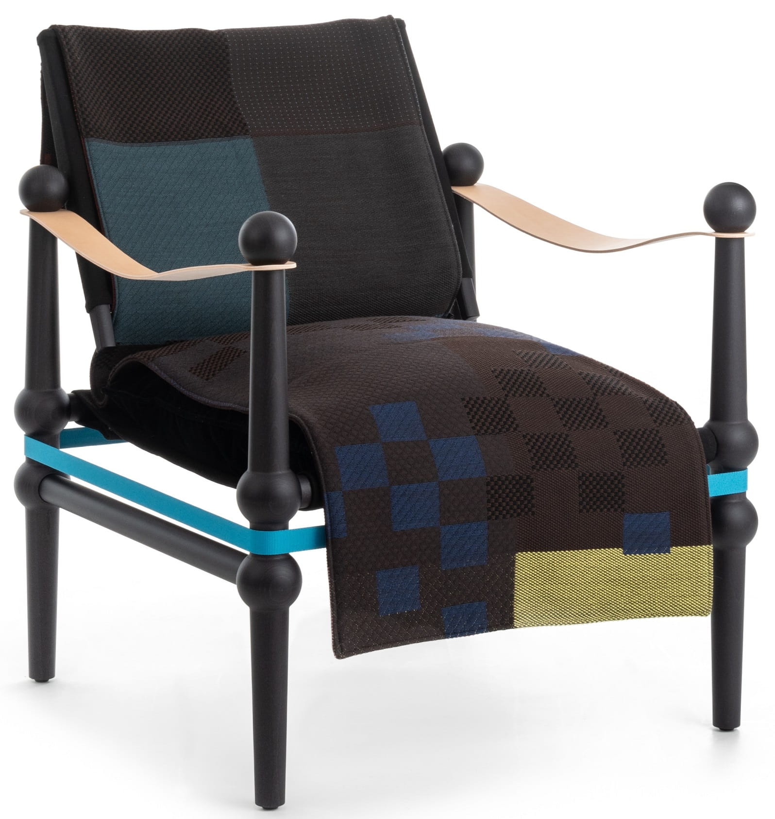 Fotel Twain to unikalne połączenie tradycyjnego rzemiosła i nowoczesnej estetyki. Jego konstrukcja bazuje na solidnej, drewnianej ramie o zaokrąglonych krawędziach, co nadaje mu przyjemną, organiczną formę. Wyraziste detale, takie jak kuliste zakończenia nóżek i subtelne metalowe wzmocnienia w kontrastujących kolorach, nadają mu współczesny, dynamiczny charakter. Siedzisko i oparcie zostały wyposażone w miękkie poduszki pokryte tkaniną o geometrycznym wzorze, który podkreśla nowoczesny styl mebla. Tapicerka, inspirowana rękodziełem i tradycyjnymi tkaninami, łączy w sobie różne odcienie i faktury, tworząc wyjątkowy efekt wizualny. Charakterystyczne, lekko wygięte drewniane podłokietniki dodają fotelowi elegancji i zapewniają komfort użytkowania. Twain to mebel, który doskonale sprawdzi się zarówno w nowoczesnych, jak i eklektycznych wnętrzach. Jego design to harmonijne połączenie klasyki i współczesności, które czyni go nie tylko wygodnym fotelem, ale także dekoracyjnym elementem aranżacji przestrzeni.