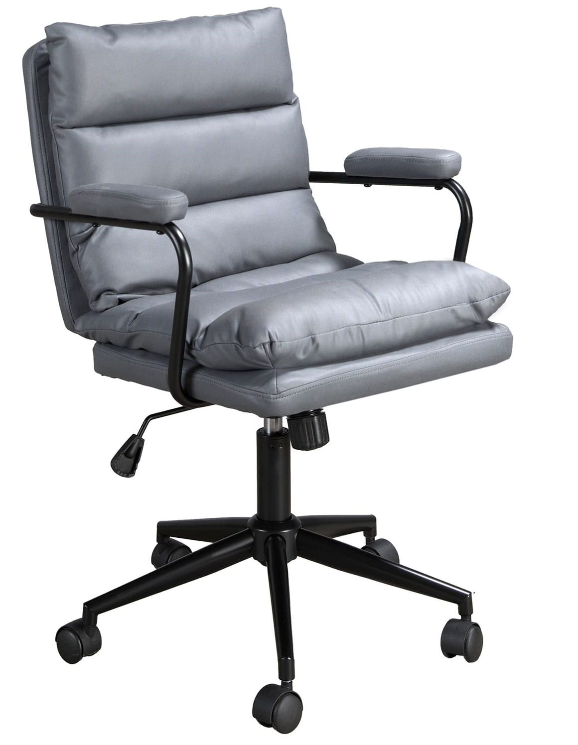 Nowoczesny fotel biurowy, który stawia komfort na pierwszym miejscu. Grubo pikowane siedzisko, oparcie i podłokietniki przypominają poduszki, które otulają ciało miękkością, zapewniając relaks nawet podczas intensywnego dnia pracy. Jasnoszara tapicerka wprowadza do wnętrza świeżość i subtelność, jednocześnie zachowując profesjonalny charakter. Minimalistyczna konstrukcja z czarnego metalu dodaje lekkości i stabilności, a mechanizm regulacji wysokości oraz mobilna podstawa na kółkach sprawiają, że fotel dostosowuje się do indywidualnych potrzeb użytkownika. Idealny do domowego biura, gabinetu lub przestrzeni coworkingowej, gdzie funkcjonalność spotyka się z nowoczesną estetyką. To mebel, który nie tylko uprzyjemnia pracę, ale też uzupełnia aranżację wnętrza o elegancki, współczesny akcent.