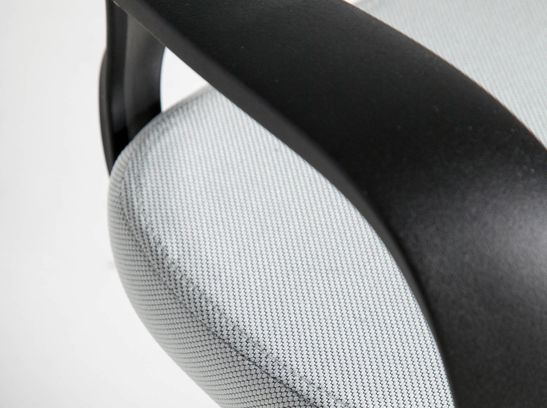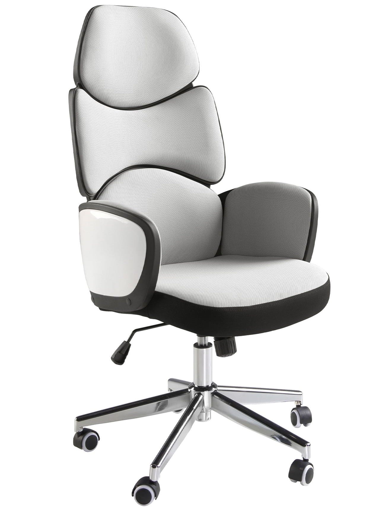 Obrotowy fotel biurowy o nowoczesnym wzornictwie z siedziskiem tapicerowanym jasnoszarą tkaniną i oparciem z białego błyszczącego PVC. Posiada podłokietniki, co czyni