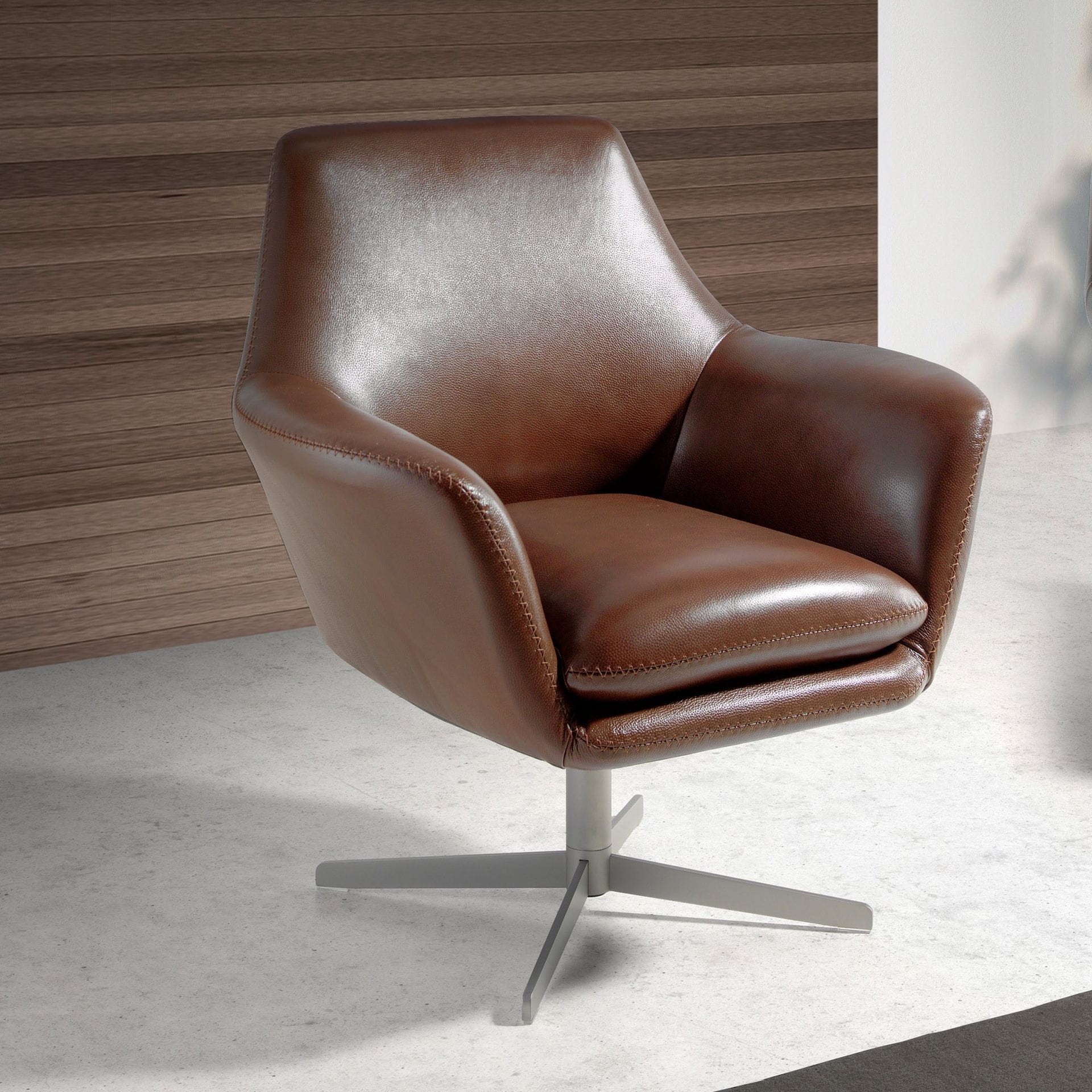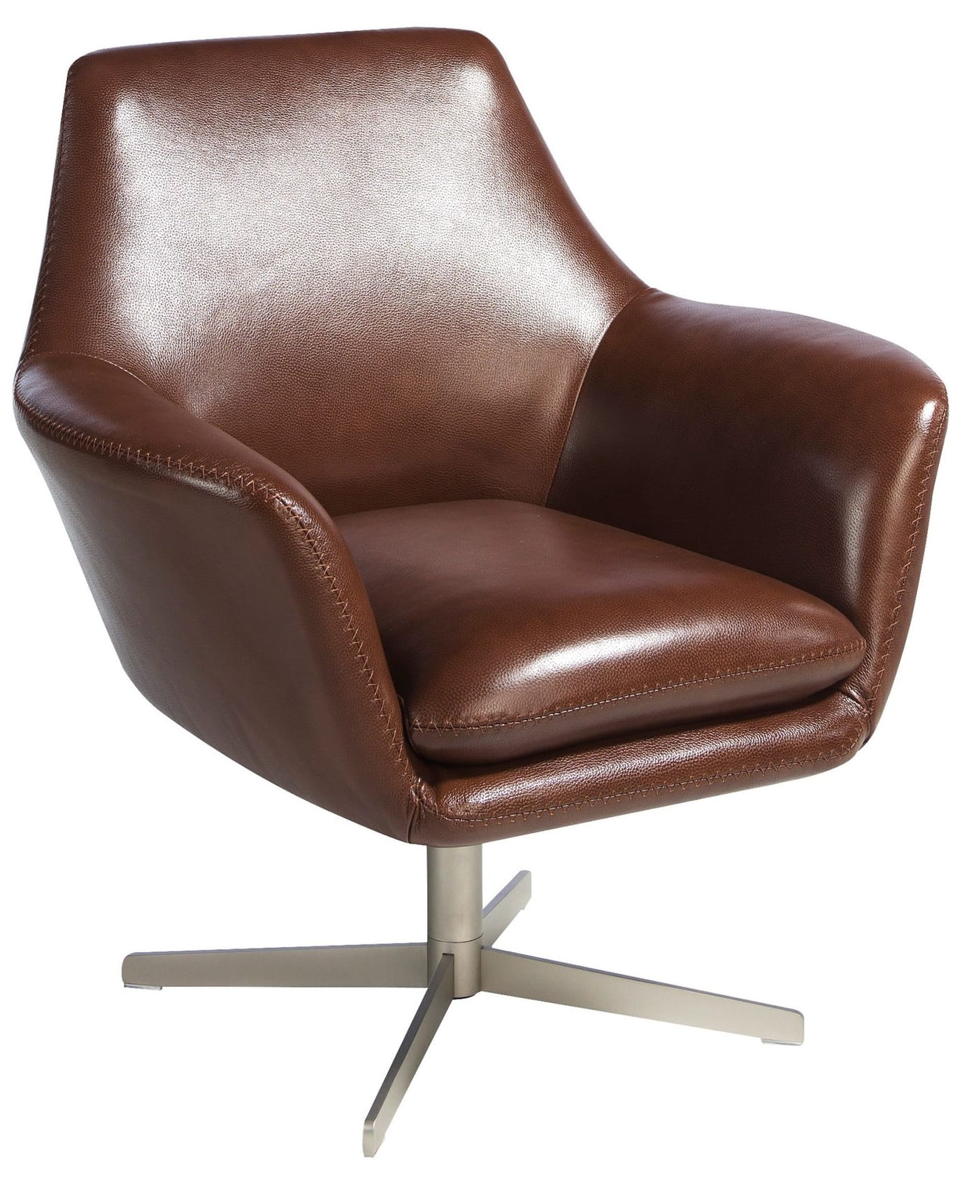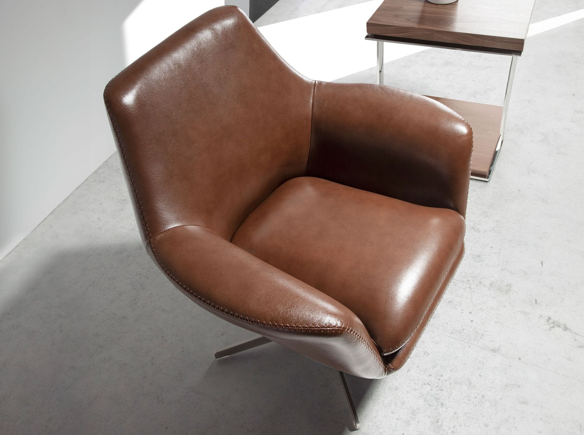 Nowoczesny fotel obrotowy z podłokietnikami, siedziskiem i oparciem obitym skórą bydlęcą w kolorze koniakowym. Zarówno ze względu na styl, jak i polerowane nogi ze stali