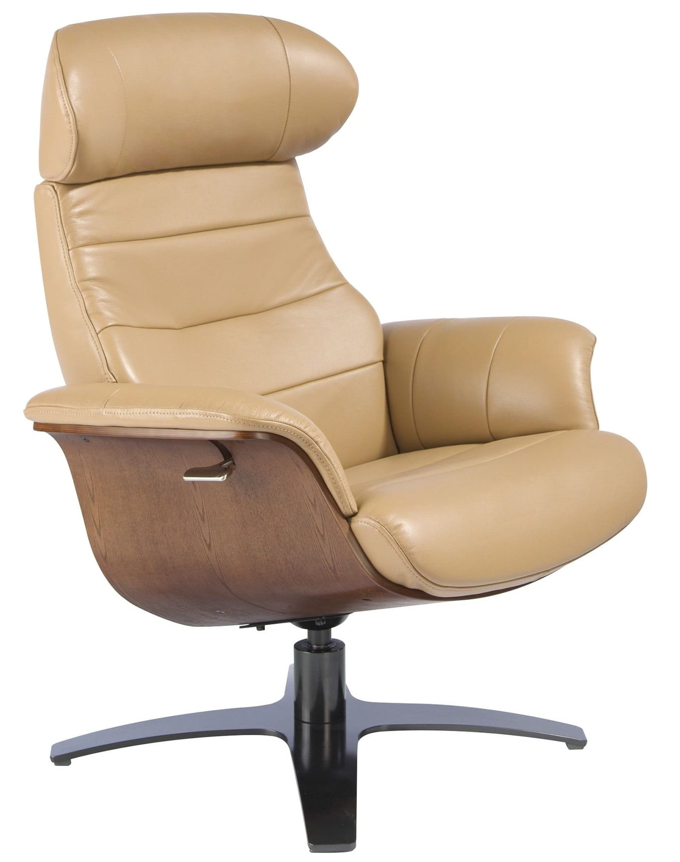 Rozkładany fotel obrotowy z nowoczesnymi podłokietnikami, siedziskiem i oparciem tapicerowanym piaskową skórą bydlęcą. Zarówno naturalne orzechowe fornirowane detale