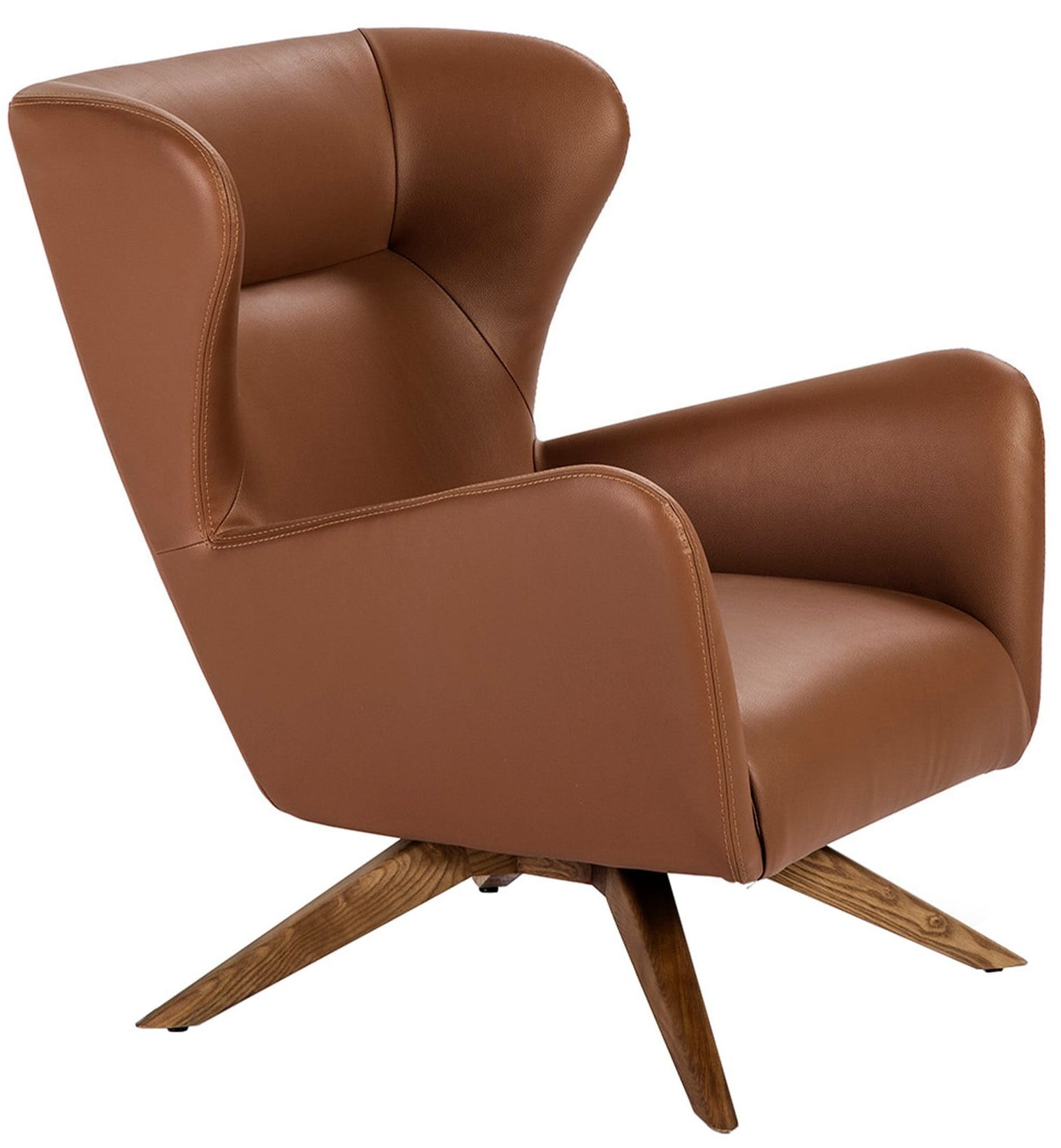 Obrotowy fotel z podłokietnikami w nowoczesnym designie z siedziskiem i oparciem tapicerowanym brązową skórą ekologiczną. Zarówno jego styl, jak i orzechowe drewniane nogi