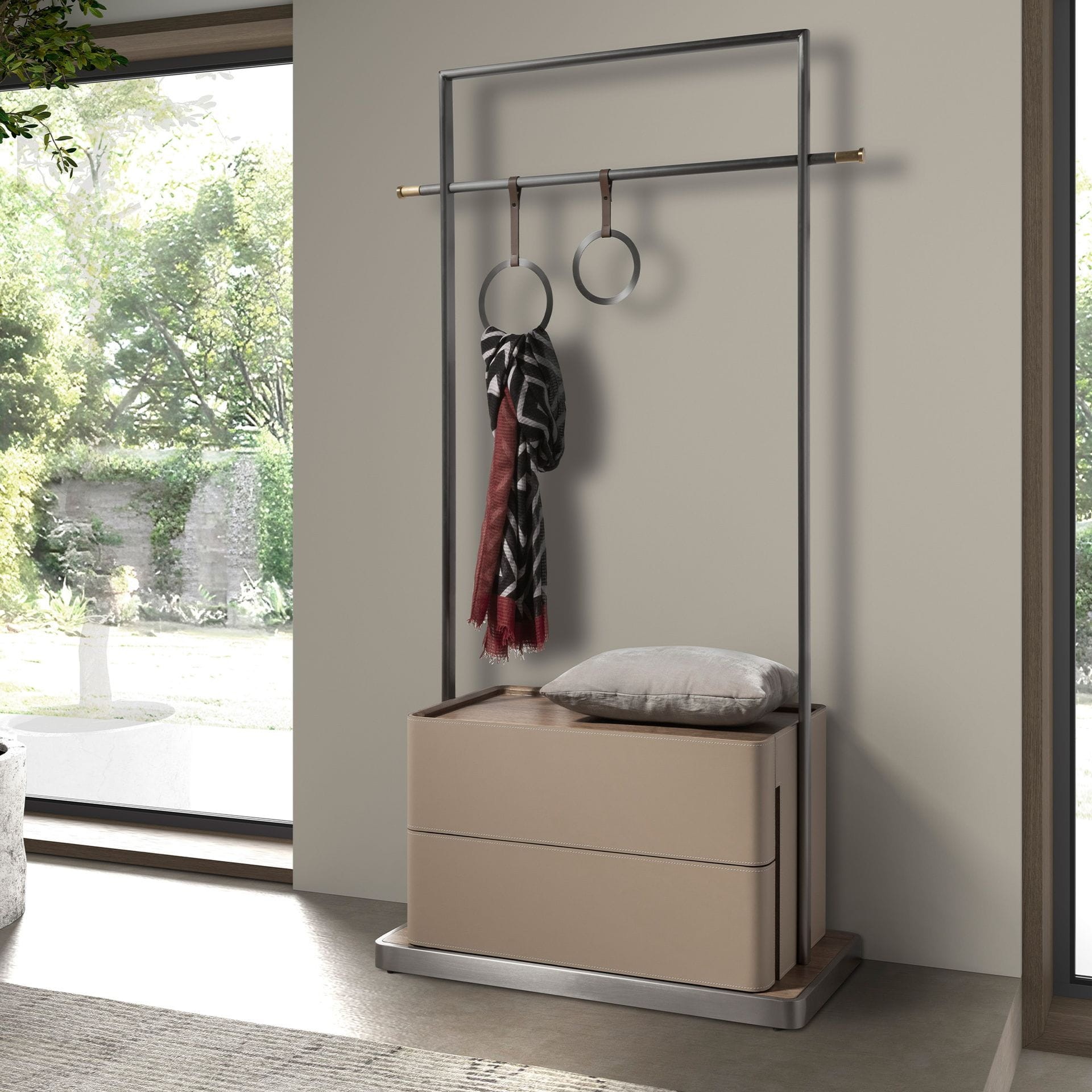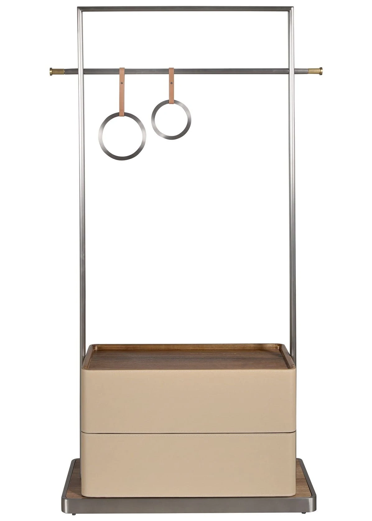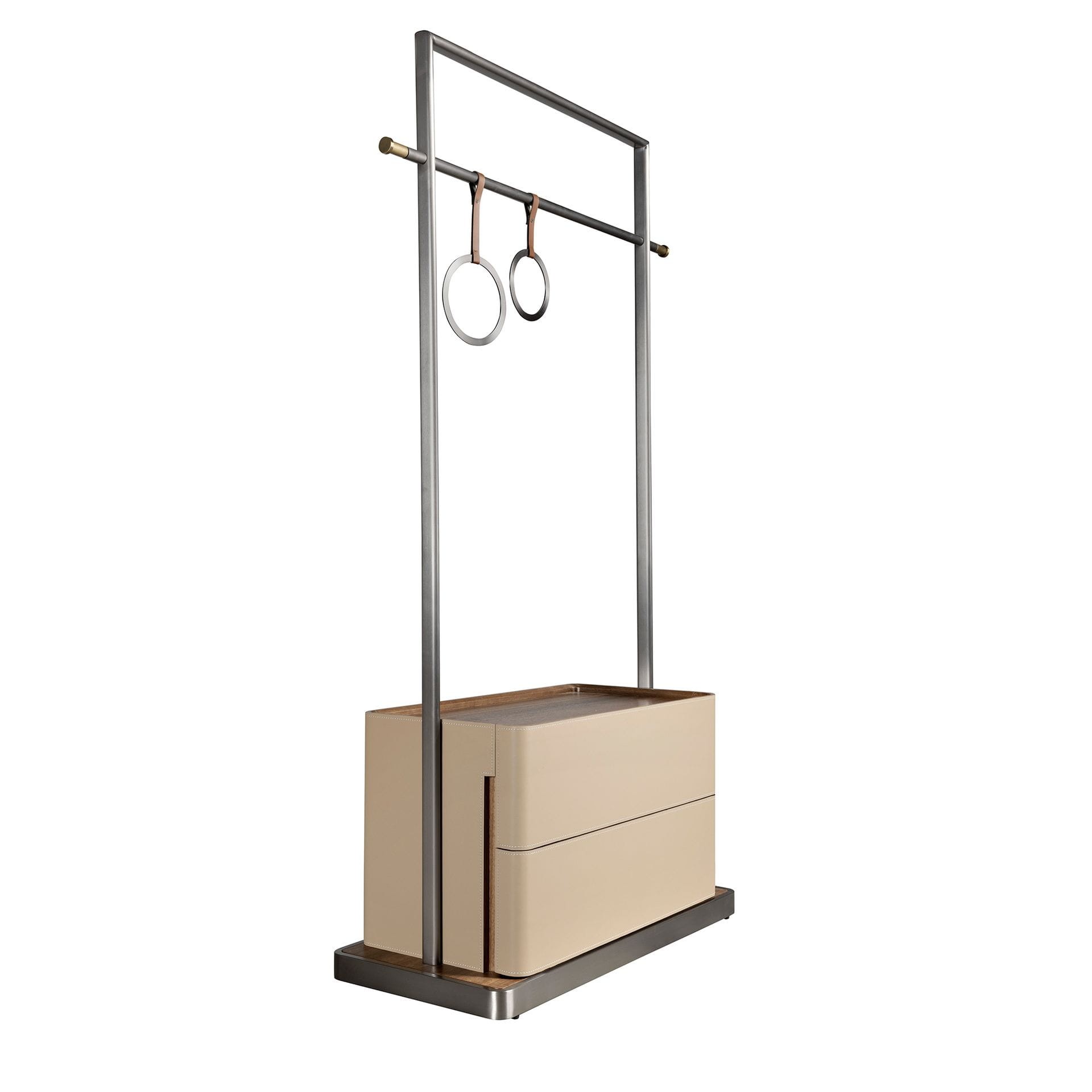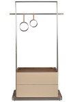 Subtelna, a jednocześnie pełna wyrazistości garderoba, która łączy funkcjonalność z artystycznym podejściem do formy. Minimalistyczna rama ze szczotkowanego metalu mieści w sobie praktyczną dolną skrzynię pokrytą beżową skórą bydlęcą oraz elegancki drążek na ubrania. Detal, który przyciąga wzrok? Dwa okrągłe uchwyty zawieszone na skórzanych paskach – zaskakujące, zabawne i niezwykle stylowe nawiązanie do świata designu i mody. Dolna część mebla skrywa pojemną przestrzeń do przechowywania, idealną na dodatki lub sezonowe akcesoria. Całość osadzona jest na subtelnej drewnianej podstawie, która dodaje ciepła nowoczesnej konstrukcji. Angel Cerdá tworzy meble, które opowiadają historie – ta garderoba to historia o harmonii, wygodzie i zamiłowaniu do detali.