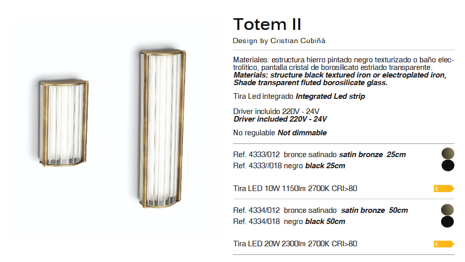 Totem w wersji ściennej przybiera formę świetlistego reliefu — smukłego, pionowego akcentu, który subtelnie zaznacza swoją obecność na płaszczyźnie ściany. Ryflowane szkło układa się w rytmiczny wzór, przez który światło przenika miękko i równomiernie, tworząc delikatną grę refleksów oraz cieni. Metalowa oprawa w ciepłym, szlachetnym wykończeniu obejmuje szkło niczym rama, nadając całości wyważony, elegancki charakter. Kontrast pomiędzy transparentnością szkła a solidnością metalu buduje formę ponadczasową — osadzoną pomiędzy klasyką a nowoczesnością, z dyskretnym echem stylu retro. Totem nie dominuje przestrzeni, lecz ją porządkuje. Zamontowany w korytarzu, przy łóżku, w strefach wspólnych hotelu czy restauracji, staje się źródłem nastrojowego, rozproszonego światła. To oprawa, która podkreśla architekturę wnętrza i wprowadza spokojną, elegancką atmosferę.