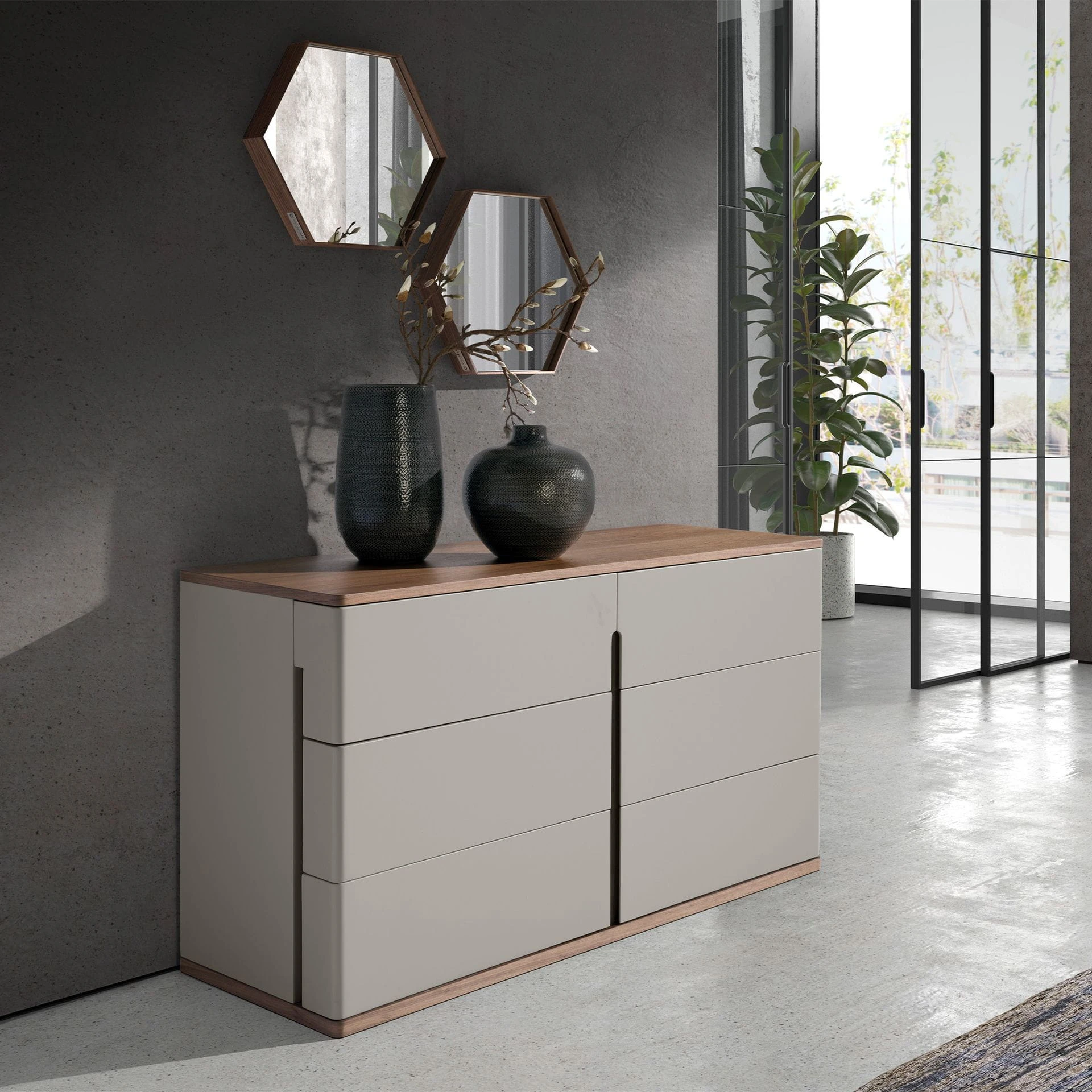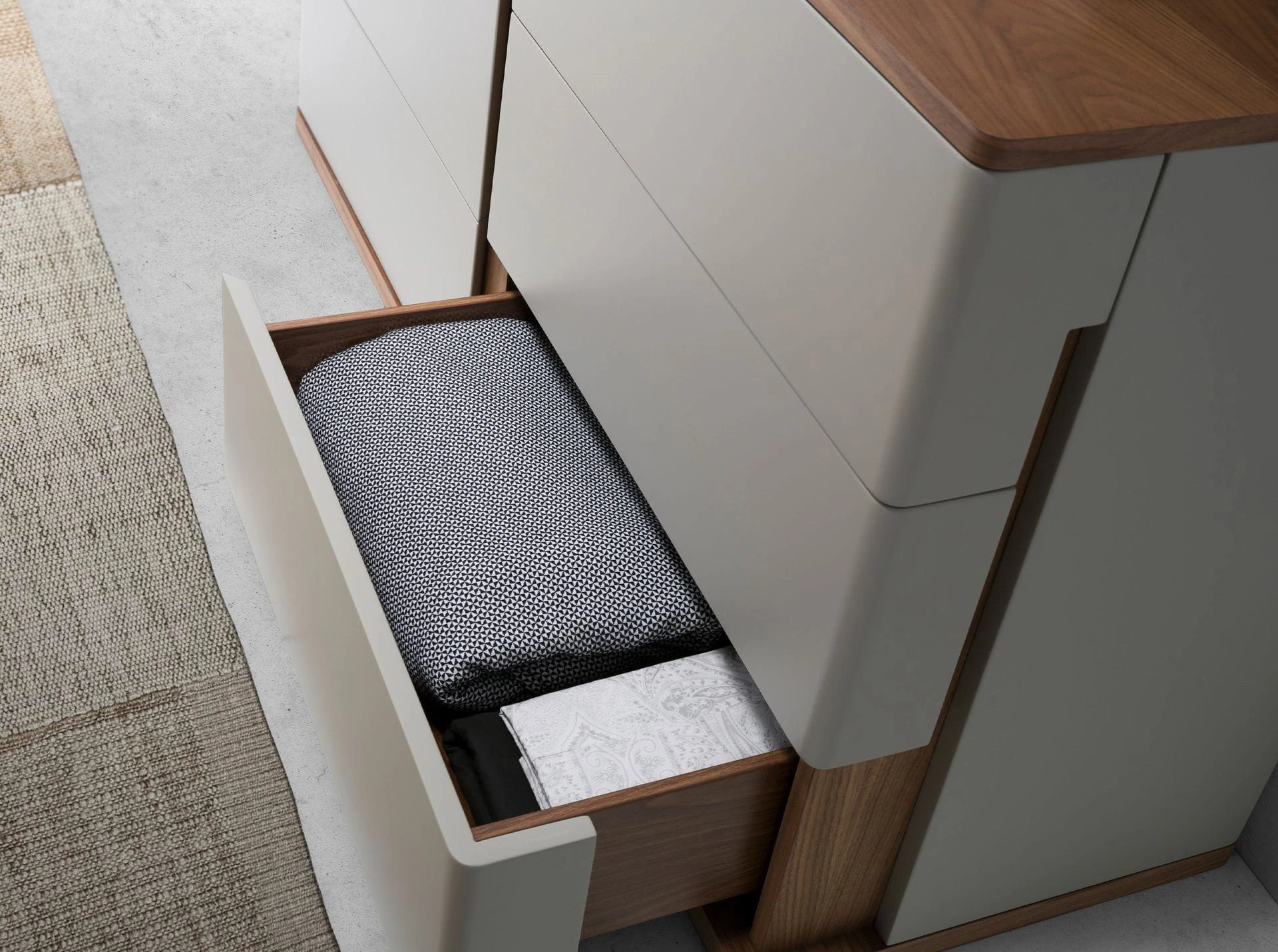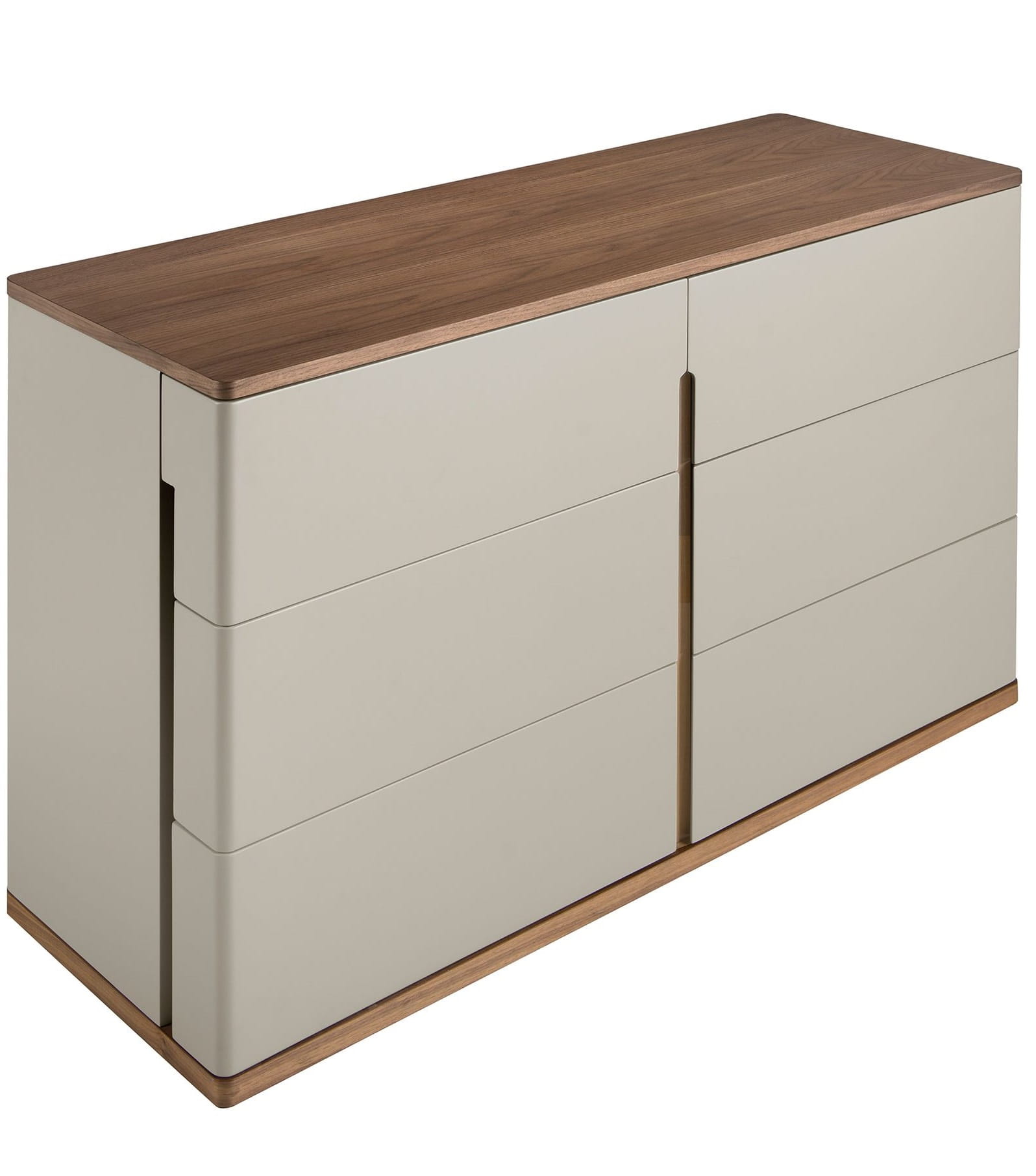 Ta komoda przypomina ciche spotkanie mlecznej mgły z ciepłym światłem słońca – jej delikatne, jasne fronty zdają się przenikać z naturalnym, orzechowym blatem i podstawą. Zaokrąglone krawędzie otulają całą bryłę przyjemną miękkością, jakby stworzono ją z myślą o subtelnym tańcu światła i cienia. W sześciu pojemnych szufladach skryć można domowe skarby i ulubione pamiątki, a sama komoda wprowadza do wnętrza łagodną aurę harmonii i wyciszenia. W tej kompozycji drewno i jasna tonacja barw łączą się w poetyckim dialogu natury z nowoczesnością, sprawiając, że mebel staje się zarówno funkcjonalnym towarzyszem codzienności, jak i artystycznym akcentem pełnym przytulnego uroku.