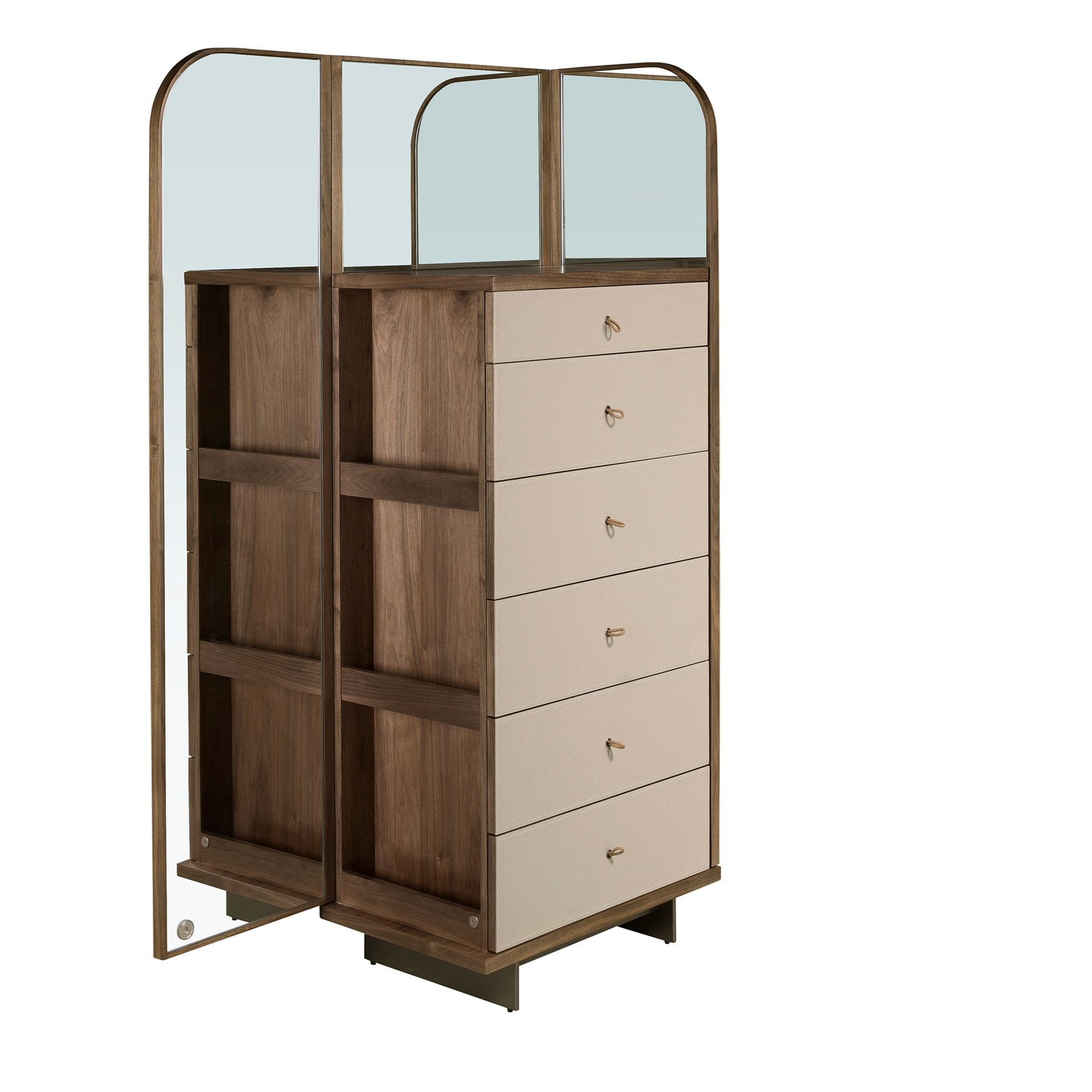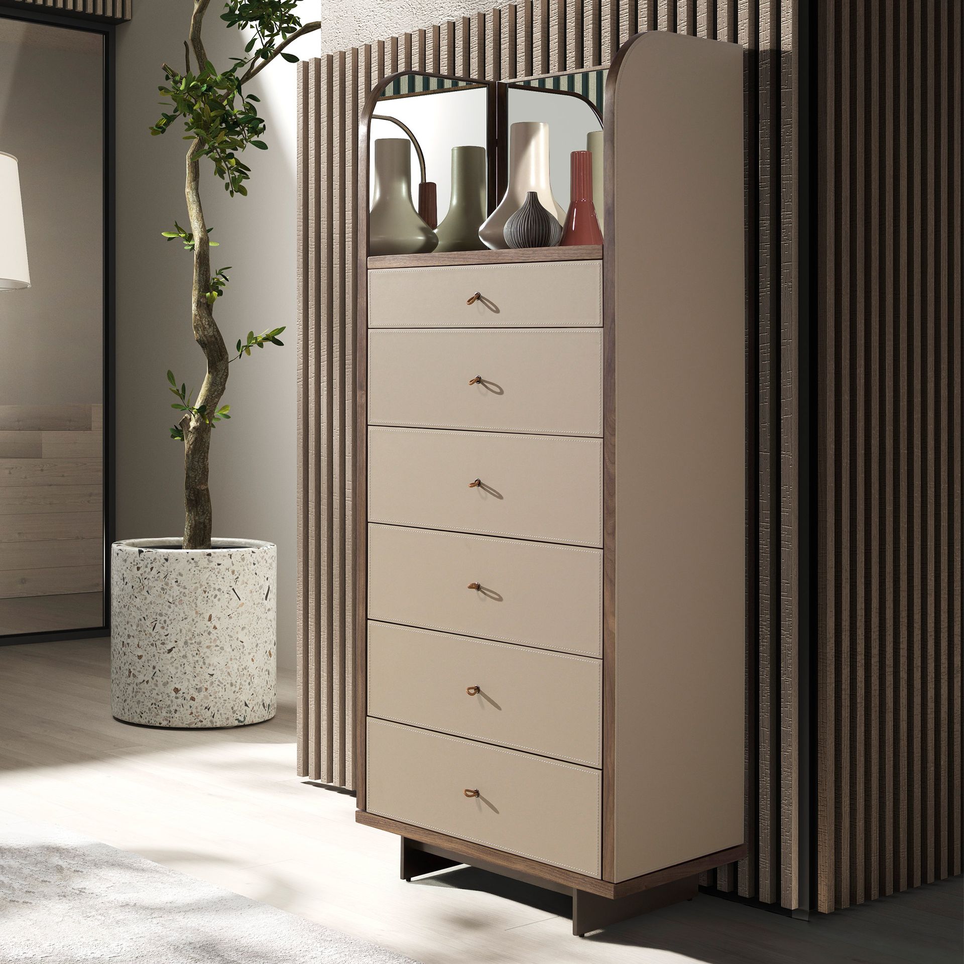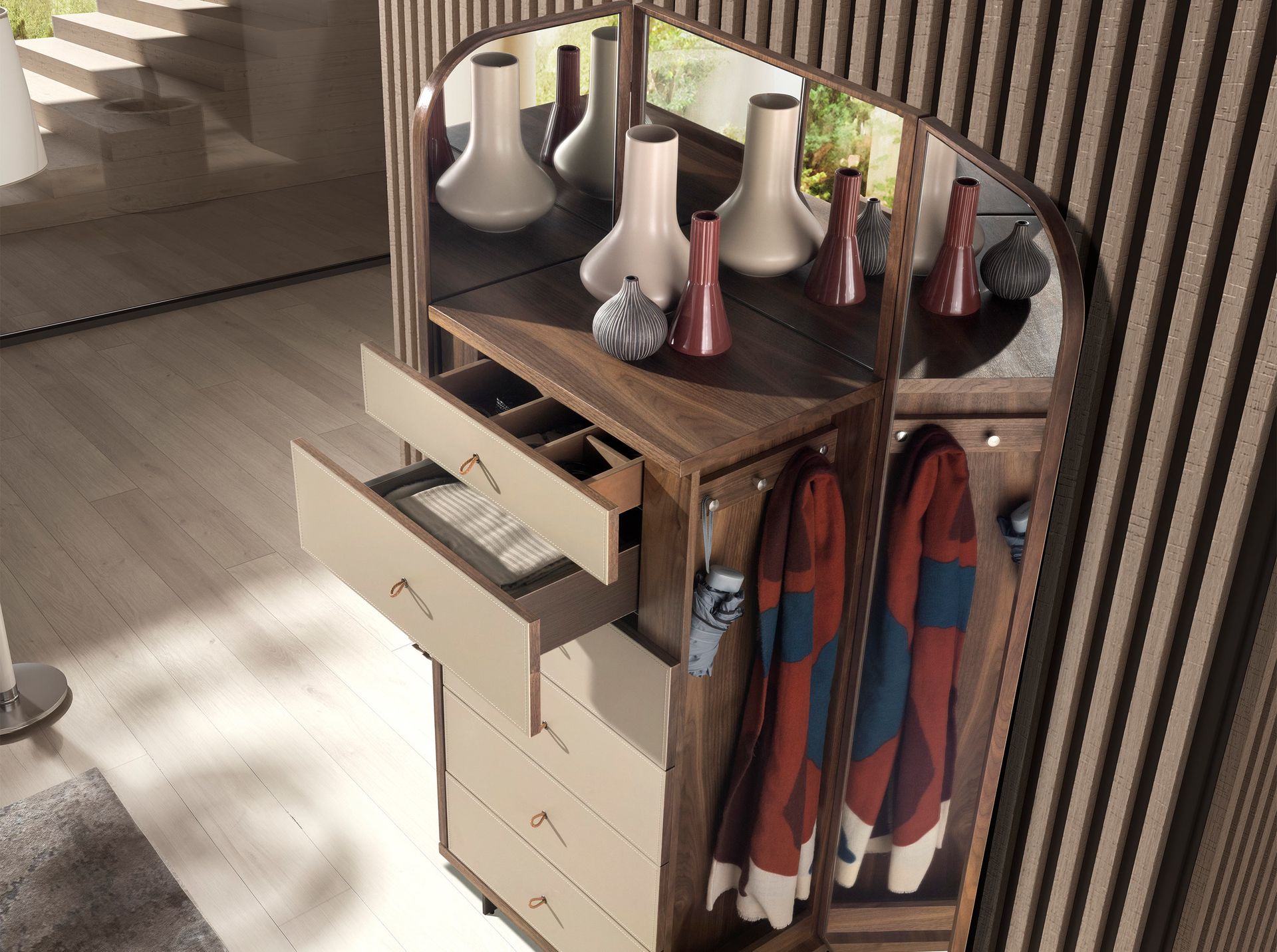 W świetle poranka odbijającym się w szlachetnych taflach lustra, komoda Angel Cerdá staje się nie tylko meblem, lecz również subtelnym rytuałem codzienności. Z każdej strony emanuje kunsztem — od delikatnie zaokrąglonych krawędzi po skórzane fronty szuflad, których rysunek przywołuje na myśl doskonałą harmonię między geometrią a rzemiosłem. To nie jest zwykły mebel do przechowywania. To dyskretna garderoba, miejsce na drobiazgi i dodatki, które zasługują na swoją przestrzeń. Szuflady ukryte za eleganckimi uchwytami ze skóry i metalu prowadzą do wnętrza, które kryje uporządkowaną przestrzeń na biżuterię, akcesoria i codzienne drobiazgi. Boczna szafka, schowana za lustrzanymi skrzydłami, staje się idealnym miejscem na płaszcze, torebki czy parasol. To mebel stworzony z myślą o tych, którzy celebrują detal i cenią funkcję splecioną z estetyką. W przedpokoju, garderobie lub sypialni — wszędzie tam, gdzie liczy się pierwsze wrażenie i porządek skryty w elegancji.