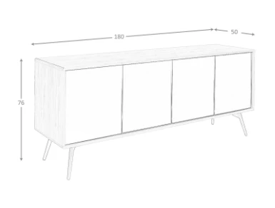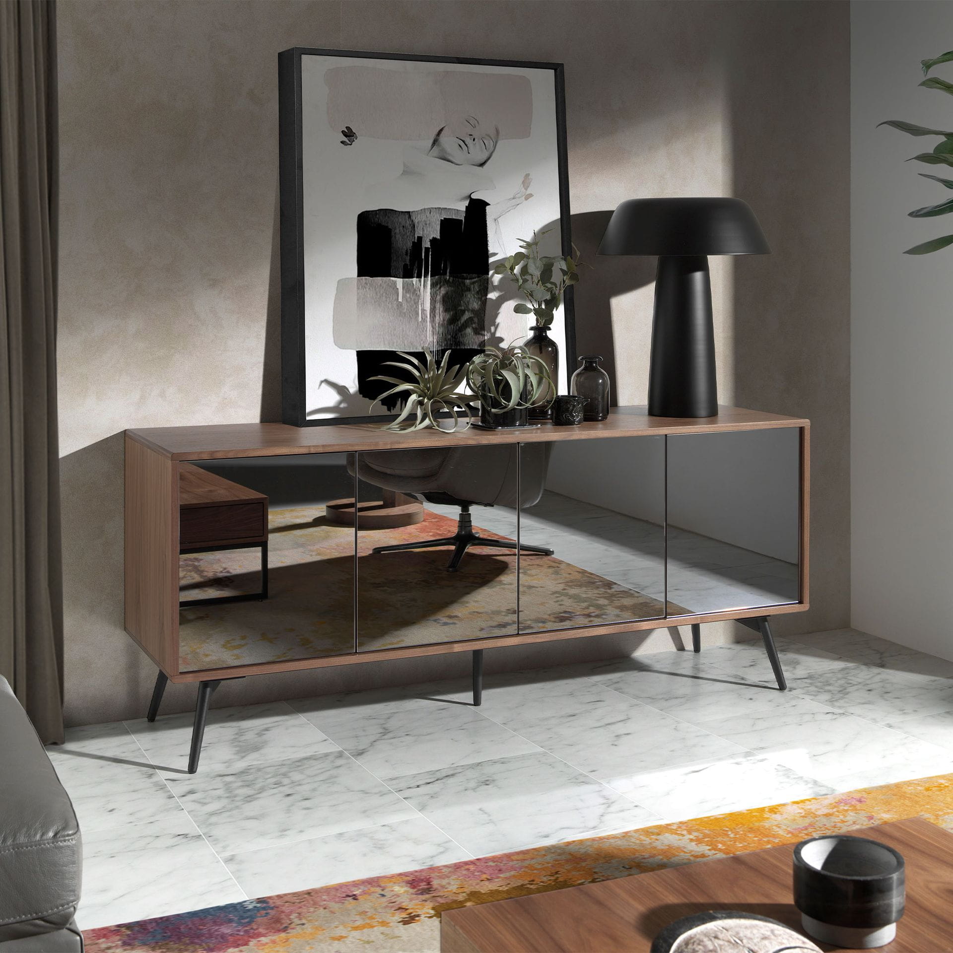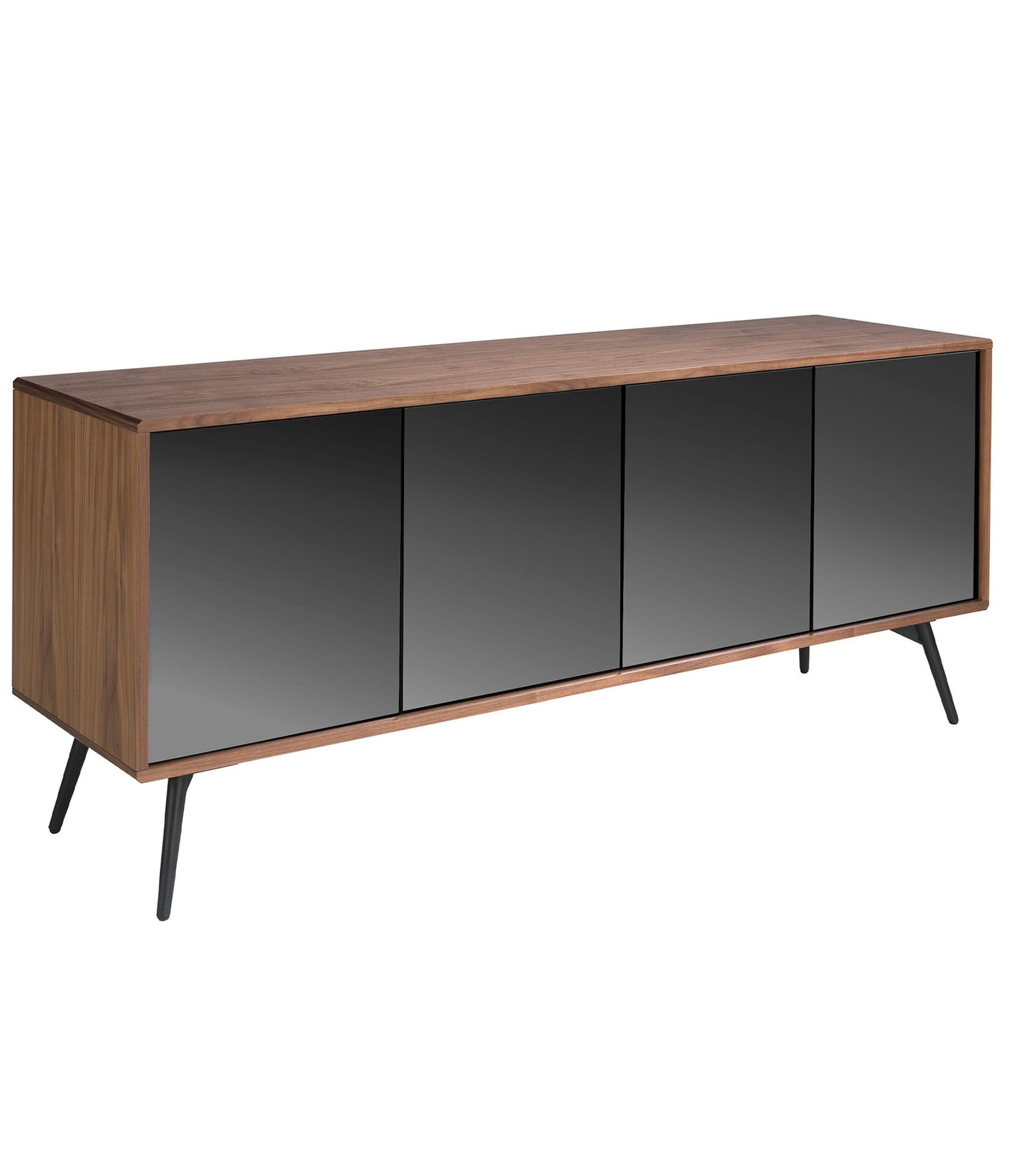 Wysoki kredens o nowoczesnym designie z drewnianą konstrukcją fornirowaną naturalnym orzechem i oryginalnymi nogami ze stali nierdzewnej malowanymi farbą epoksydową na