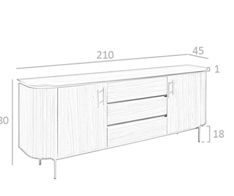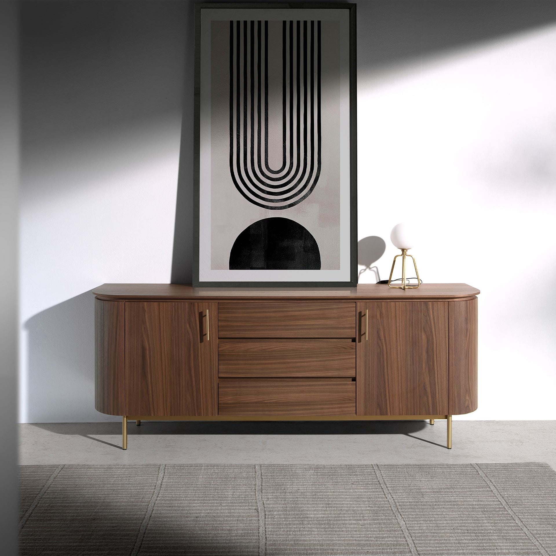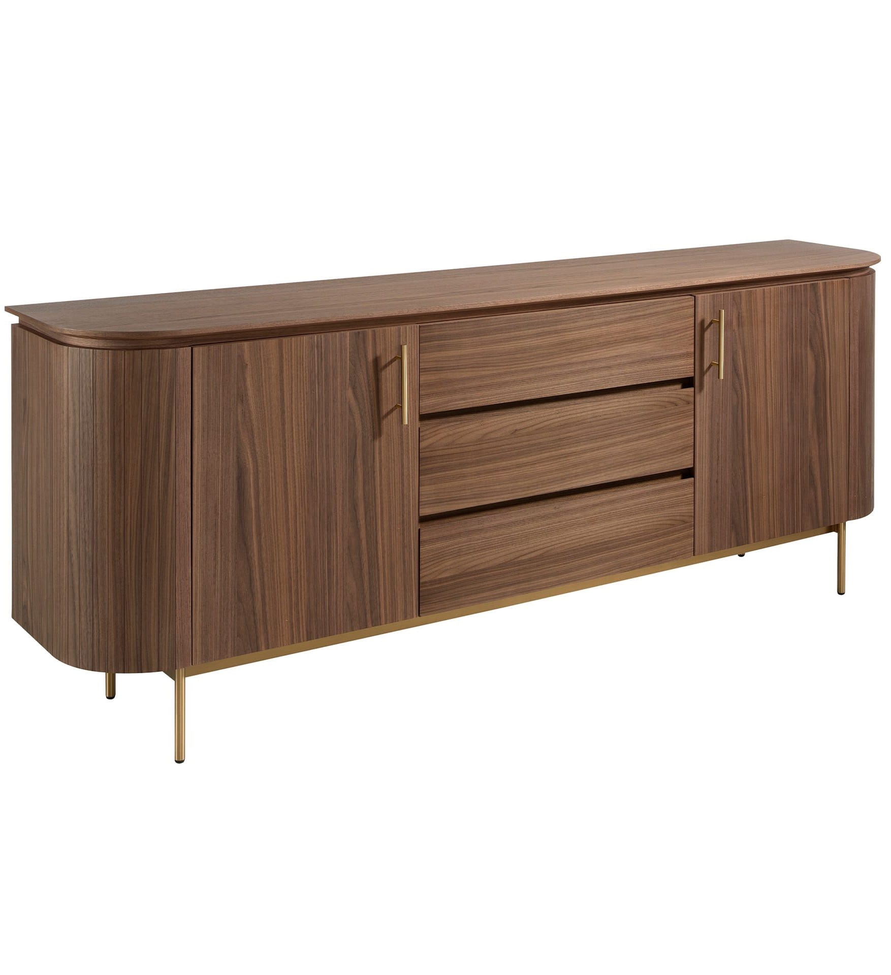 Komoda o nowoczesnym designie ze strukturą drewna fornirowanego naturalnym orzechem i oryginalnymi nogami ze stali nierdzewnej polerowanej w złotym kolorze. Posiada dużą