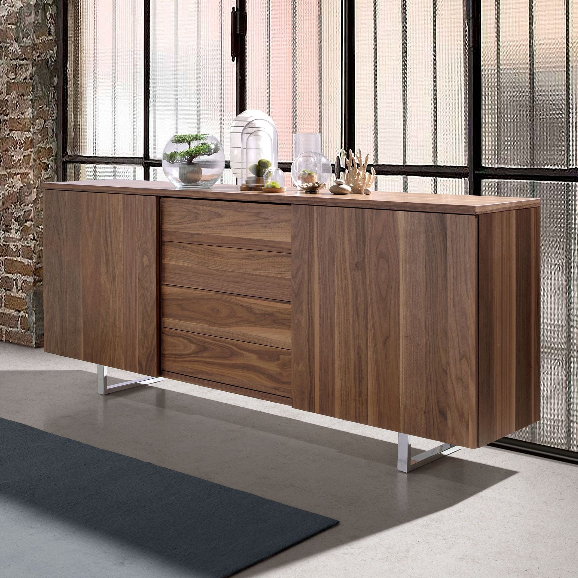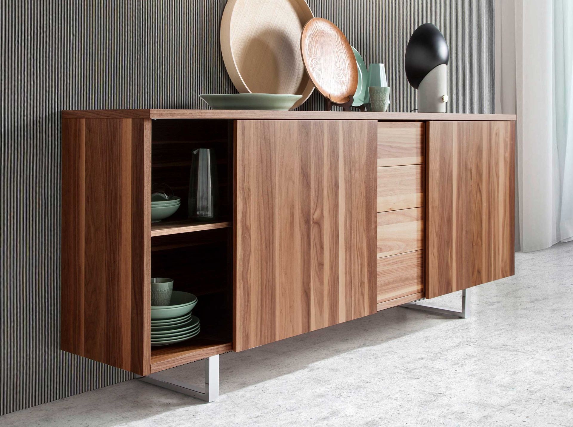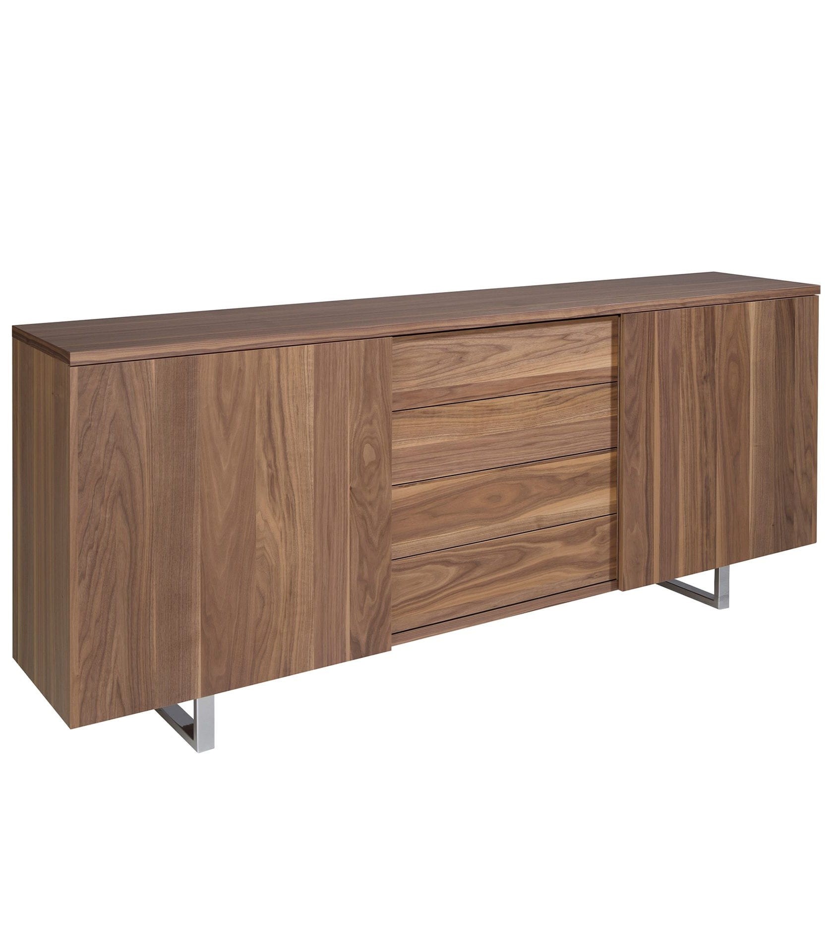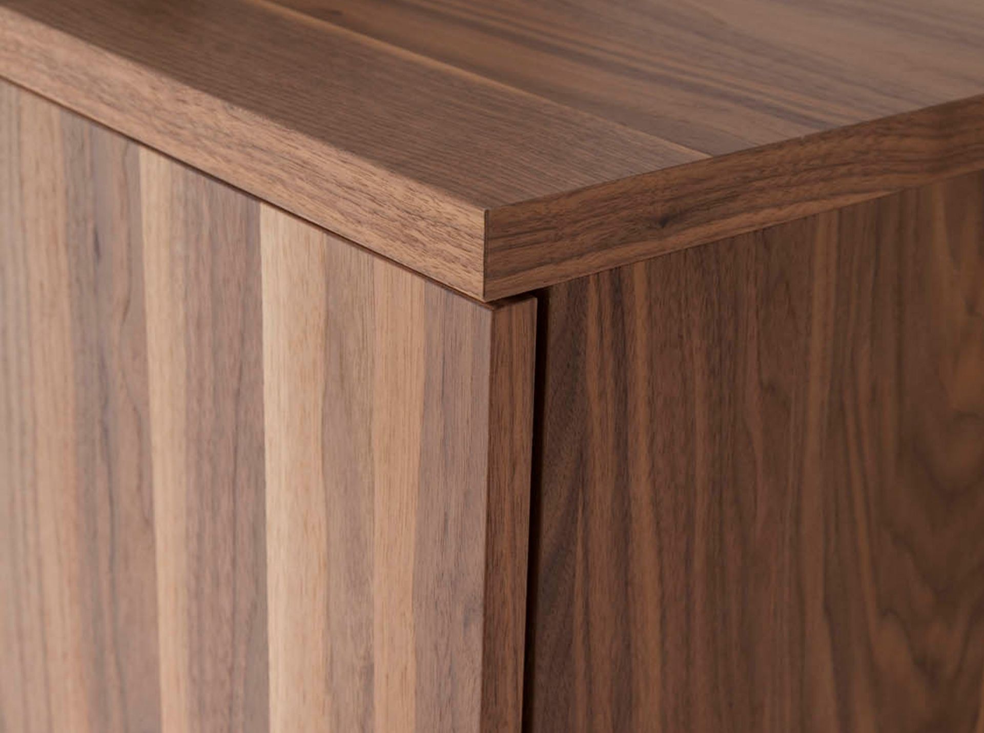 Komoda o nowoczesnym designie ze strukturą drewna fornirowanego naturalnym orzechem i oryginalnymi nogami ze stali nierdzewnej chromowanej. Detale w naturalnym fornirze