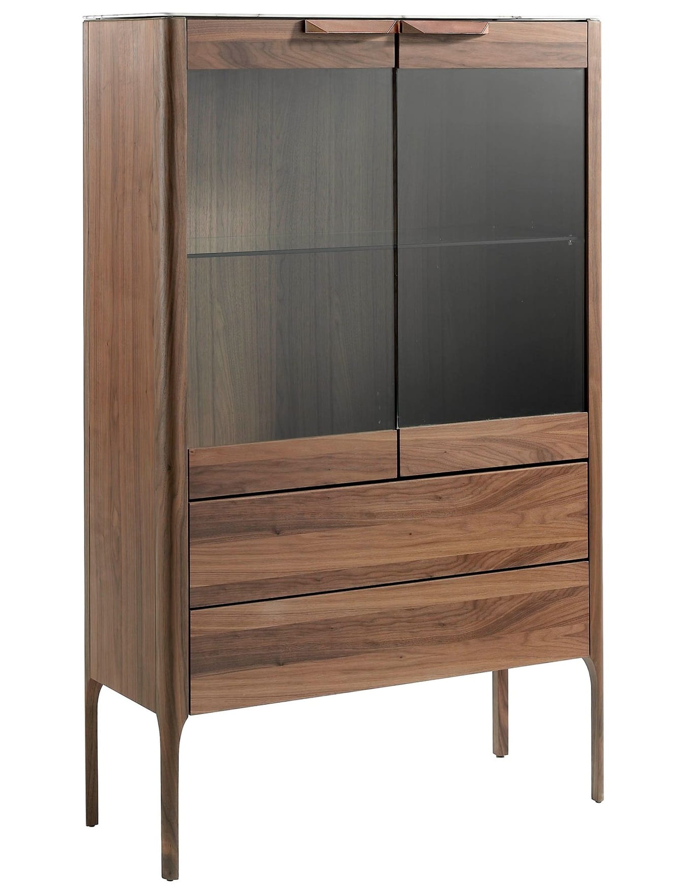 Materiał: drewno fornirowane naturalnym orzechem, stal nierdzewna, szkło hartowane