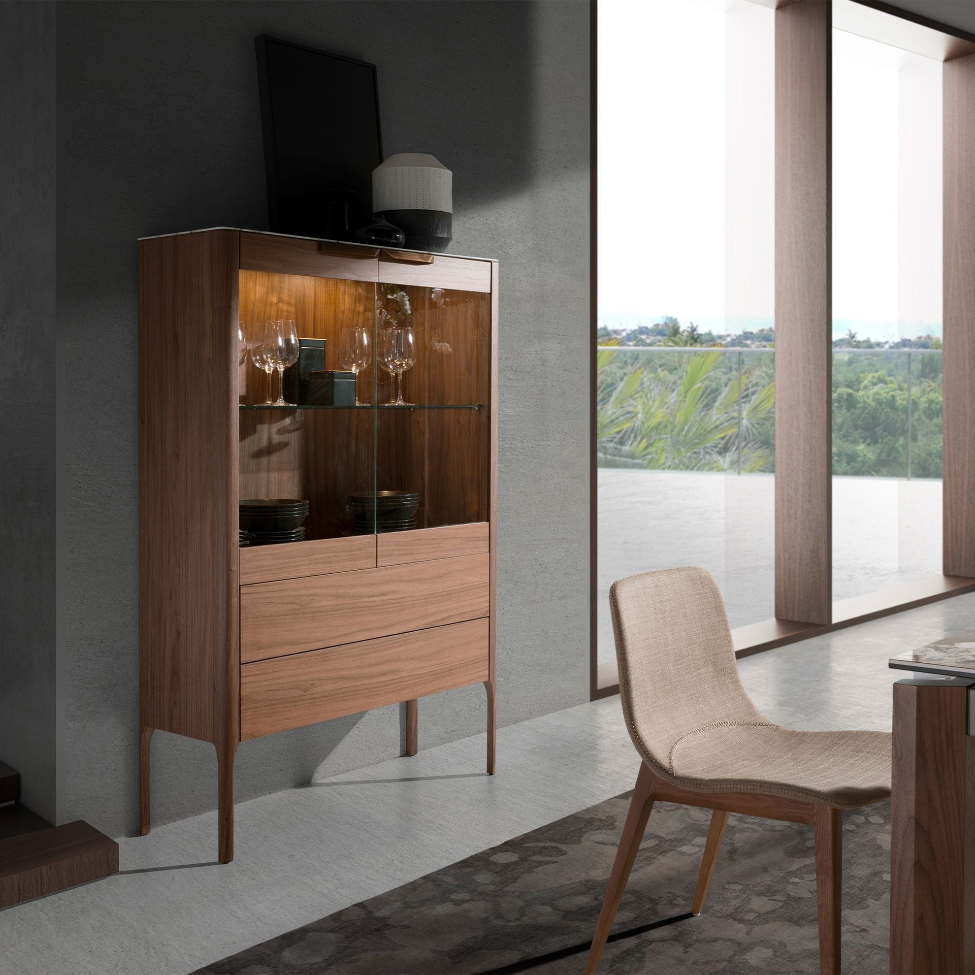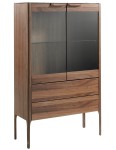 Nowoczesny kredens z konstrukcją z drewna fornirowanego naturalnym orzechem. Oświetlenie wnętrza tego kredensu pozwoli stworzyć ciepłą i relaksującą atmosferę, zapewniając