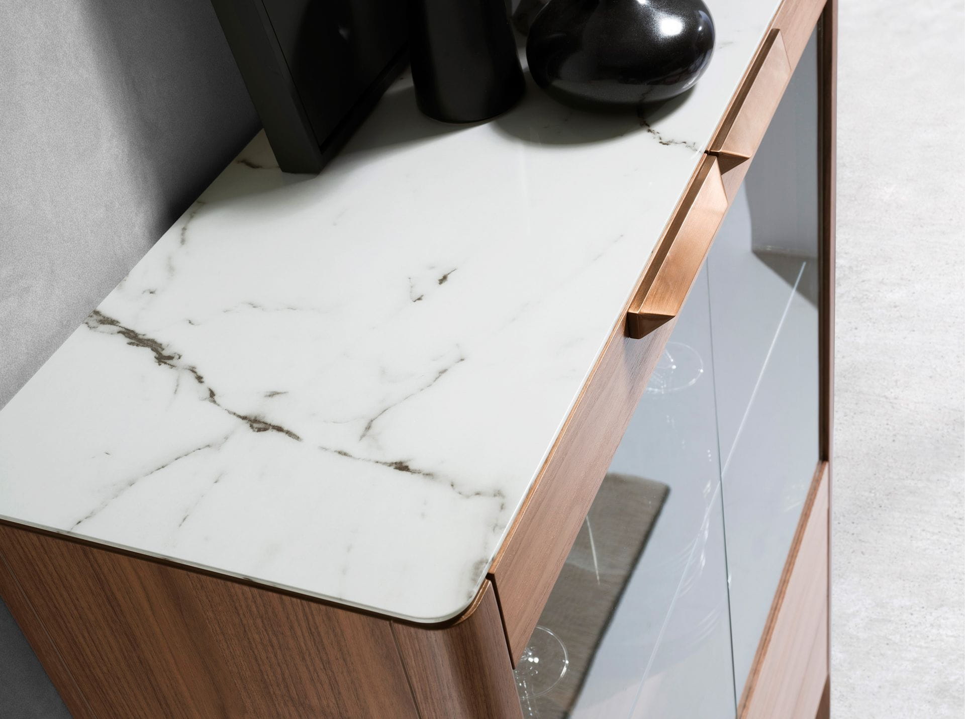 jednocześnie lepszy widok na wnętrze mebla. Dzięki eleganckiemu szklanemu blatowi z białej imitacji porcelanowego marmuru z szarymi żyłkami i błyszczącym wykończeniem