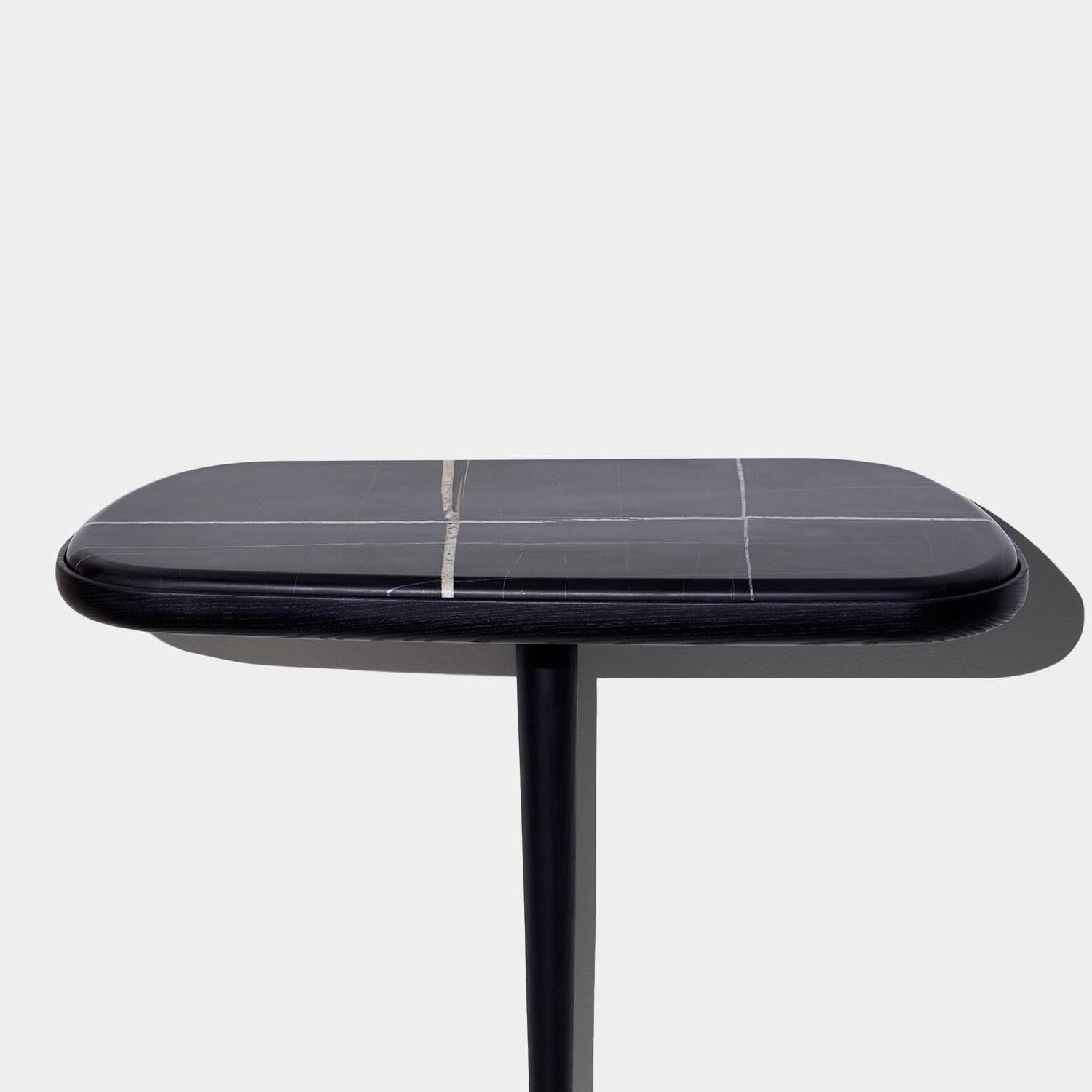 Minimalistyczna forma oparta na jednej, smukłej nodze nadaje jej lekkości i rzeźbiarskiego charakteru. Blat wykonany z czarnego marmuru z delikatnym użyleniem przyciąga uwagę i wprowadza wyrafinowany, elegancki akcent. Ciemne, niemal czarne wybarwienie konstrukcji podkreśla nowoczesny i zdecydowany charakter mebla. To konsola o bardzo czystej, współczesnej estetyce – idealna do nowoczesnych wnętrz, holi lub korytarzy, gdzie ma pełnić rolę subtelnego, ale wyrazistego elementu dekoracyjnego. Sprawdzi się zarówno solo, jak i w zestawieniu z innymi meblami o prostych, szlachetnych formach.