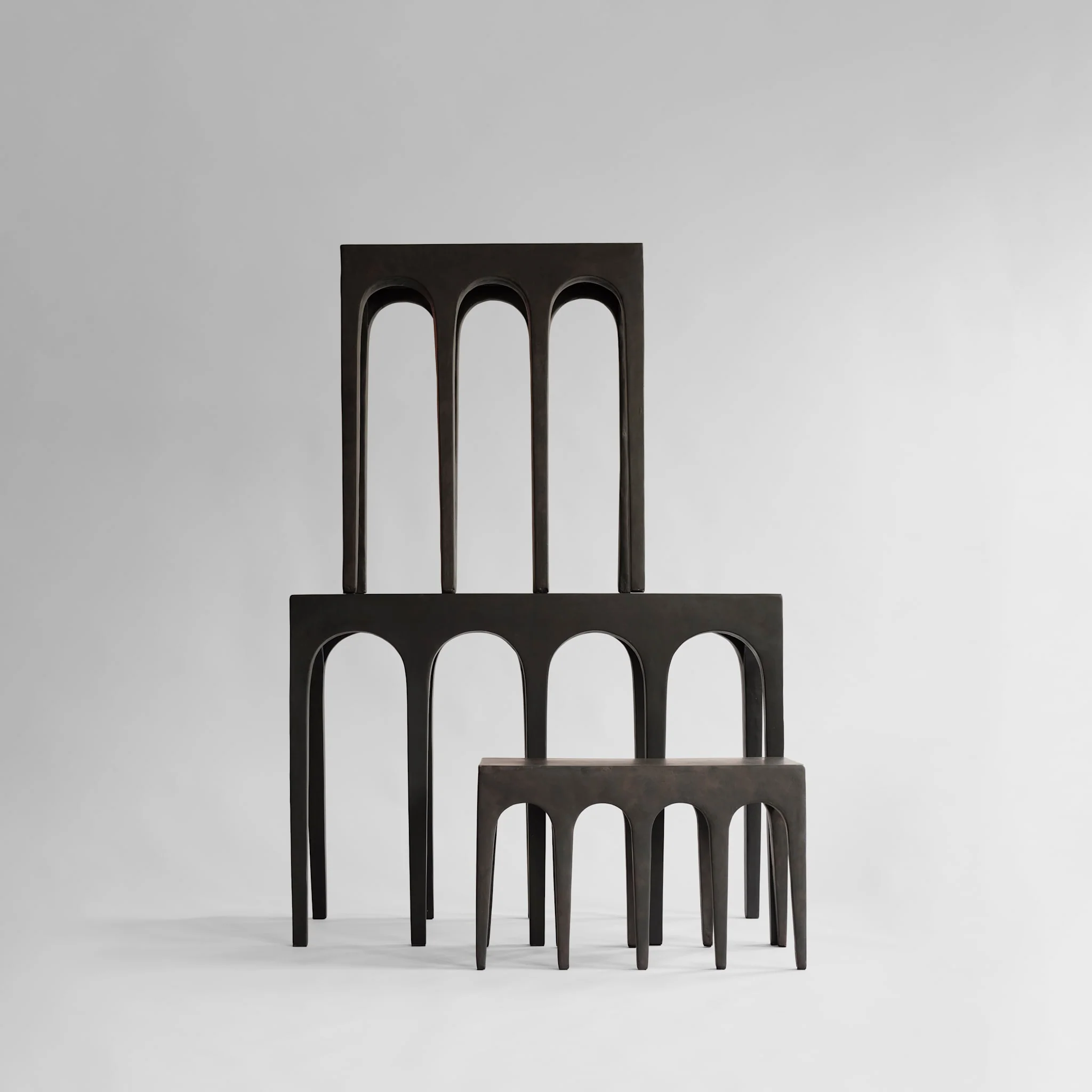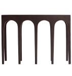 Bow to hołd dla architektonicznej harmonii i rytmu. Jej konstrukcja przywodzi na myśl klasyczne arkady – lekkie, powtarzalne łuki, które zdają się unosić blat z niebywałą elegancją. Ciemne wykończenie w odcieniu głębokiej kawy dodaje jej rzeźbiarskiego wyrazu i subtelnej powagi. Mimo swojej solidności, konsola sprawia wrażenie delikatnej, niemal lewitującej w przestrzeni. To mebel, który łączy funkcję z formą w sposób niemal poetycki – nie narzuca się, lecz emanuje spokojną siłą. Idealna do wnętrz, gdzie liczy się detal, proporcja i świadoma prostota.