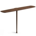 Smukła, minimalistyczna forma oparta na jednej, centralnej nodze. Wąski blat o miękko zaokrąglonych krawędziach nadaje całości lekkości i elegancji, dzięki czemu mebel nie dominuje przestrzeni. Ciemne wykończenie podkreśla nowoczesny, wyrafinowany charakter projektu. Konsola idealnie sprawdzi się w holu, przedpokoju lub jako subtelny mebel akcentowy przy ścianie. Nadaje się do odłożenia kluczy, telefonu, dekoracji lub niewielkiej lampy, zachowując przy tym wizualną lekkość i porządek we wnętrzu.