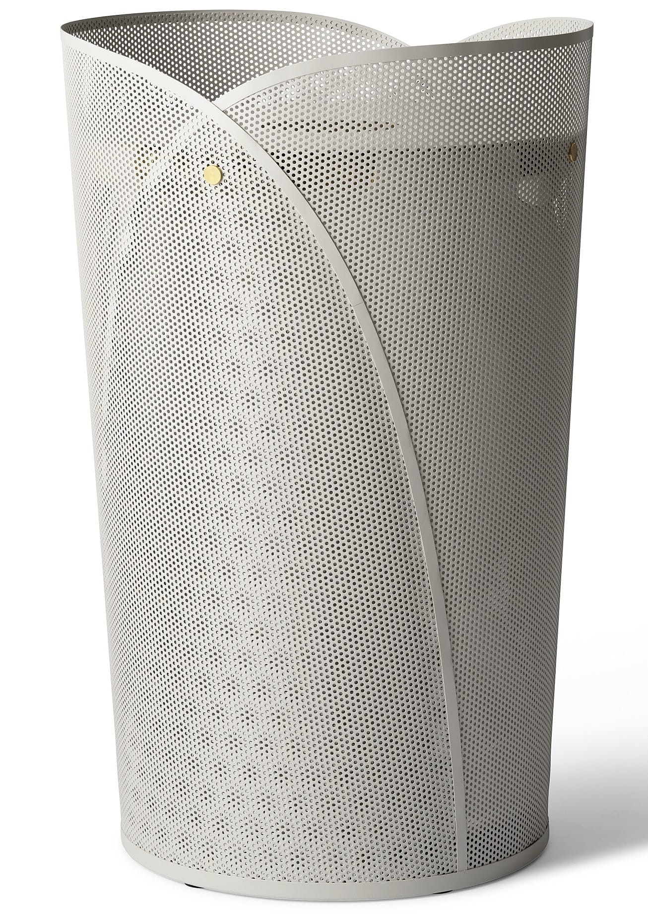 Subtelnie wygięte linie przenikają się jak miękkie fałdy tkaniny, choć całość stworzona jest z chłodnej, perforowanej stali. Przestrzeń zamknięta w lekkiej, ażurowej formie oddycha światłem i cieniem, ukazując geometryczną precyzję ujętą w poetyckim geście. Metal, zazwyczaj surowy i twardy, tutaj przyjmuje niemal organiczny charakter – płynny, miękki w odbiorze, elegancki w swojej prostocie. Drobne, złote akcenty dodają mu biżuteryjnej subtelności, jakby delikatnie spinając tę rzeźbiarską kompozycję. To przedmiot, który nie tylko służy, lecz także zdobi. Wnosi do wnętrza harmonię, porządek i wyciszającą estetykę, łącząc praktyczność z wyrafinowaną lekkością formy.
