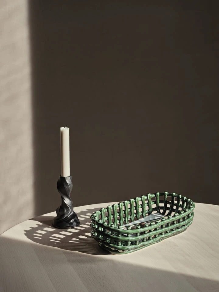 Ceramic to wyjątkowe połączenie tradycji i nowoczesnego rzemiosła, w którym techniki plecionkarskie zostały przeniesione do świata ceramiki. Forma przywołuje znajome skojarzenia z koszami i plecionymi naczyniami, jednak materiał nadaje jej zupełnie nowy, zaskakujący charakter. Ręcznie formowana powierzchnia odtwarza rytm splotów, tworząc strukturę, która jest jednocześnie surowa i niezwykle dekoracyjna. Delikatna nieregularność formy podkreśla jej autentyczność – każdy egzemplarz różni się subtelnie od innych, nosząc ślady ręcznej pracy i indywidualnego gestu twórcy. To naczynie, które doskonale odnajduje się w centrum stołu. Może pełnić funkcję misy na owoce, chleba czy innych codziennych elementów, a jednocześnie pozostaje wyrazistym akcentem dekoracyjnym – małą rzeźbą użytkową, która przyciąga spojrzenia. Ceramic wnosi do wnętrza ciepło, teksturę i poczucie rękodzielniczej autentyczności – łącząc znajomą formę z nowym, artystycznym wyrazem.