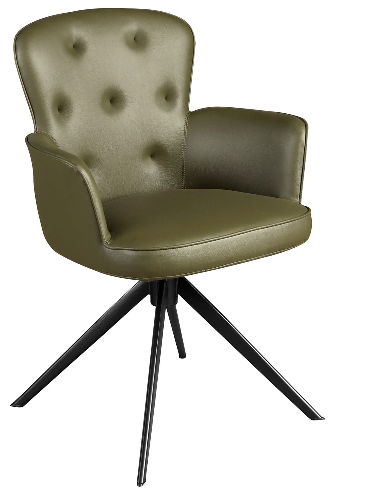 form, a jego oliwkowa tapicerka z ekoskóry nadaje całości odważnego, a zarazem eleganckiego wyrazu. Zintegrowane podłokietniki zapewniają wygodę, a obrotowa,