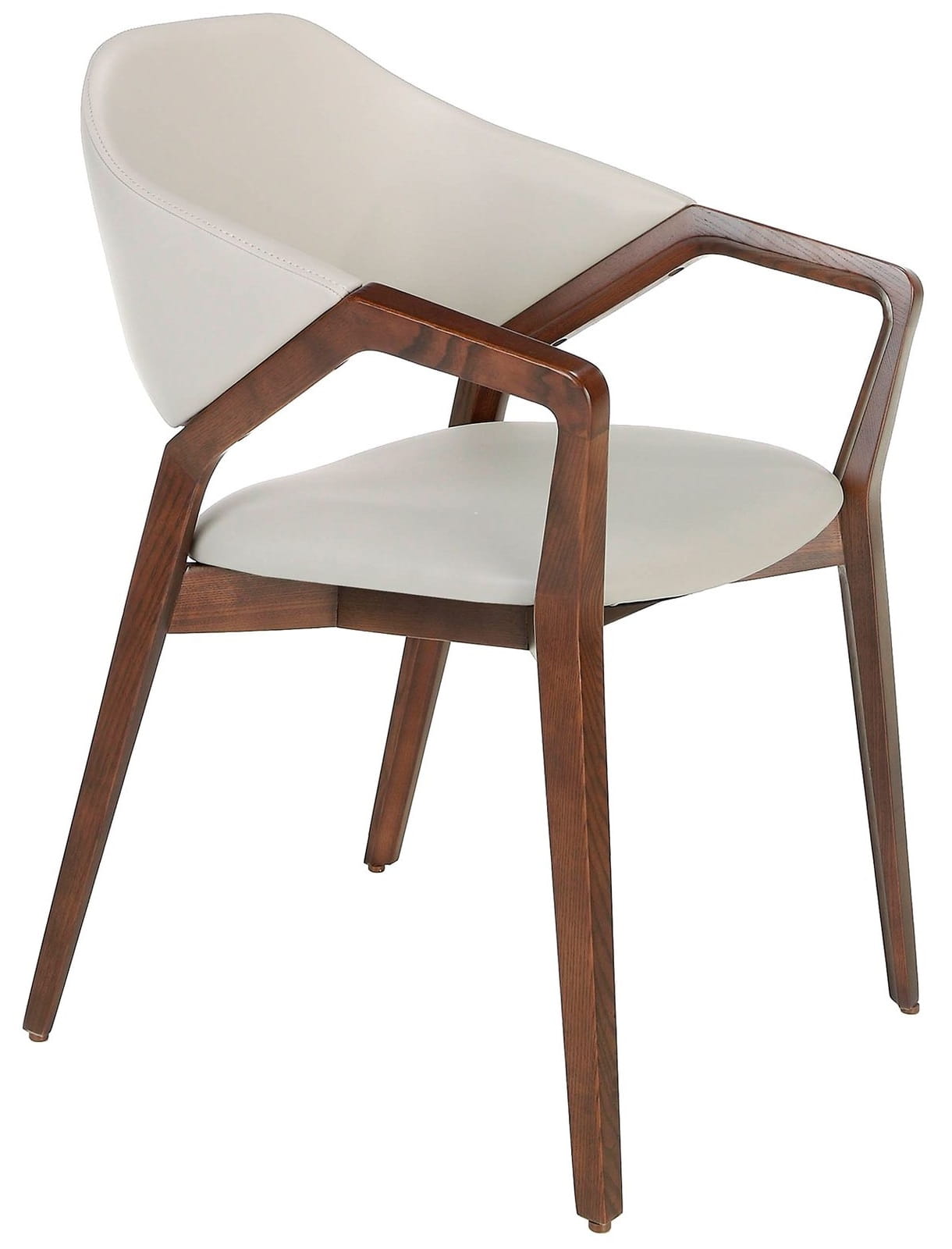 Krzesło o nowoczesnym designie z siedziskiem i oparciem tapicerowanym kremową skórą ekologiczną. Drewniane nogi w kolorze orzecha w awangardowym, a zarazem