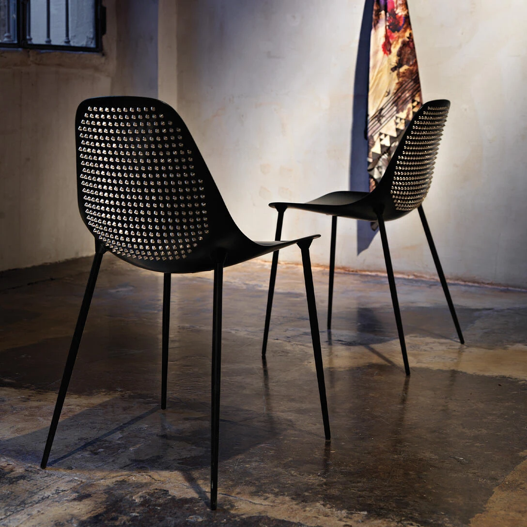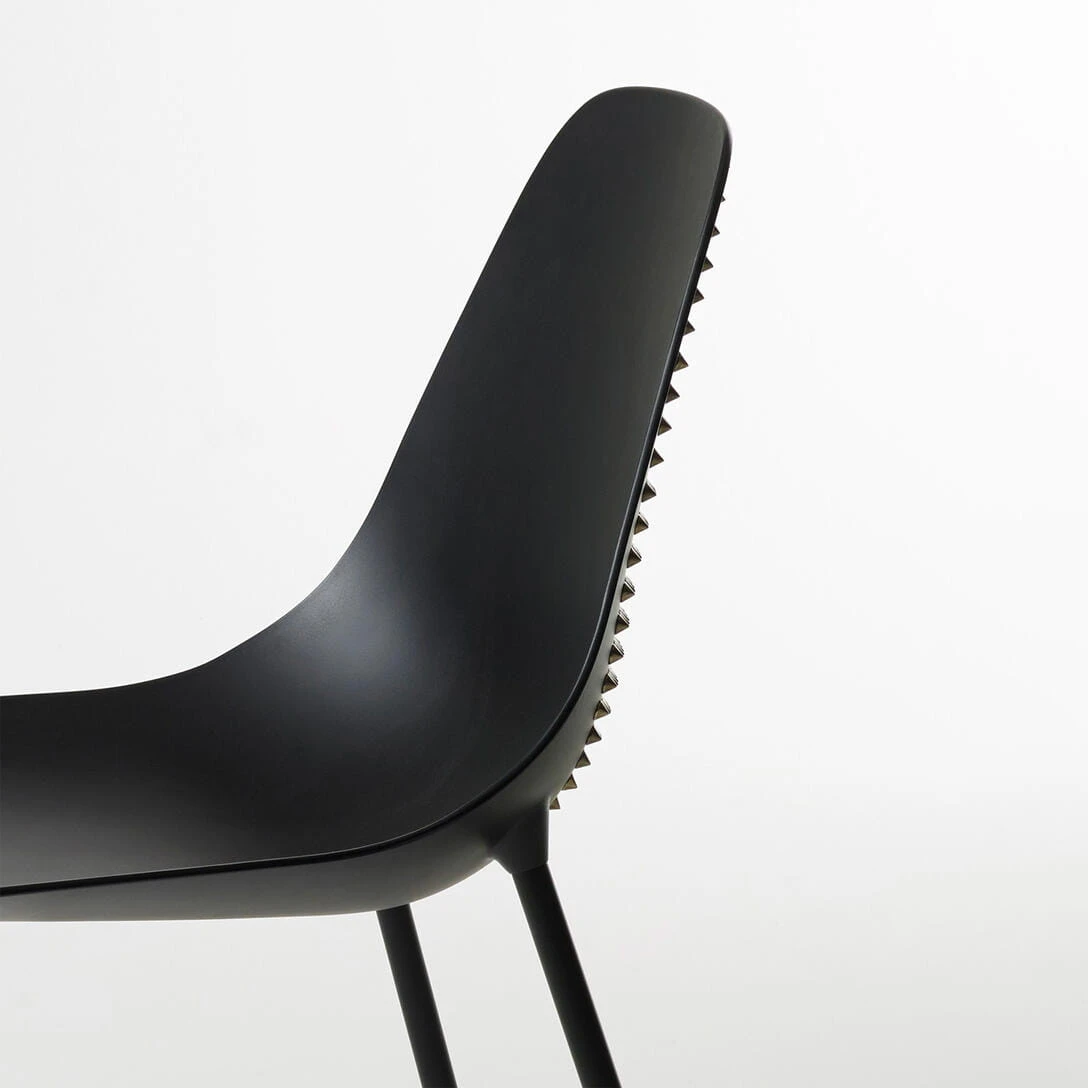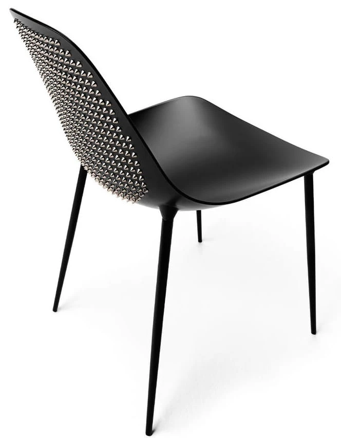 To krzesło jest manifestem niezależności – połączeniem klasycznej formy i niepokornego ducha. Czarne, matowe wykończenie chłonie światło, tworząc tło dla metalicznych akcentów, które migoczą jak biżuteria w ruchu. Każdy detal, każda linia ma w sobie napięcie – równowagę pomiędzy elegancją a surową energią. Wygląda jak rzeźba, która ożywa w przestrzeni – minimalistyczna, ale pełna ekspresji. Z tyłu połyskują rzędy ćwieków, niczym odważne podpisy projektanta, wyrażające bunt i pewność siebie. To przedmiot stworzony nie tylko do siedzenia, lecz do opowiadania historii. Historii o wolności, o designie, który nie boi się emocji i o pięknie, które rodzi się tam, gdzie estetyka spotyka odwagę.