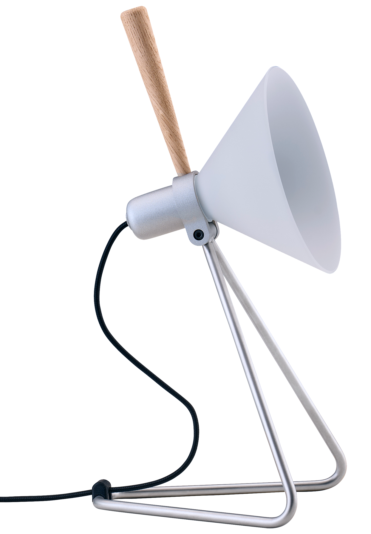 Ten projekt to wizualny manifest nowoczesnej prostoty i skandynawskiego wyczucia formy. Delikatny, biały klosz w kształcie szerokiego stożka rozprasza światło w sposób miękki i kojący, jakby rozlewał ciszę i spokój na całą przestrzeń. Spoczywa na lekkiej, geometrycznej konstrukcji z malowanego proszkowo metalu, której czyste linie rysują w powietrzu subtelną, architektoniczną grafikę. W kontrapunkcie dla chłodnej perfekcji metalu pojawia się ciepły detal – uchwyt z drewna dębowego w wyjątkowym odcieniu. Ten akcent wprowadza nutę naturalności i zmysłowego kontrastu. Długi przewód swobodnie układa się na blacie czy podłodze, dodając lampie odrobiny swobodnej nonszalancji. To oprawa, która nie potrzebuje dekoracyjnych ornamentów, by zwracać na siebie uwagę – jej siła tkwi w równowadze proporcji i materiałów. Dzięki przemyślanej konstrukcji może służyć zarówno jako lampka stołowa, jak i kinkiet, z lekkością adaptując się do różnych potrzeb wnętrza. Jest jak świetlny instrument – wystarczy dotknąć, by nastroić przestrzeń na spokojne wieczory, chwile skupienia czy intymne rozmowy. Światło, które wydobywa się z jej wnętrza, ma w sobie coś z rytuału – staje się cichym towarzyszem codzienności i ponadczasowym symbolem wyrafinowanego gustu.