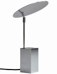 Reflect przypomina artystyczną grę światła i lustrzanych odbić. Jej geometryczna podstawa o surowej, niemal architektonicznej prostocie unosi delikatnie przechyloną tarczę, która niczym księżycowe zwierciadło odbija i rozprasza blask. Całość wydaje się jednocześnie minimalistyczna i poetycka – oszczędna w formie, lecz pełna ekspresji dzięki subtelnym refleksom metalu. To oprawa, która nie tylko rozświetla przestrzeń, ale także zamienia ją w scenę świetlnych iluzji, gdzie prostota spotyka się z elegancją i odrobiną futurystycznego wdzięku.