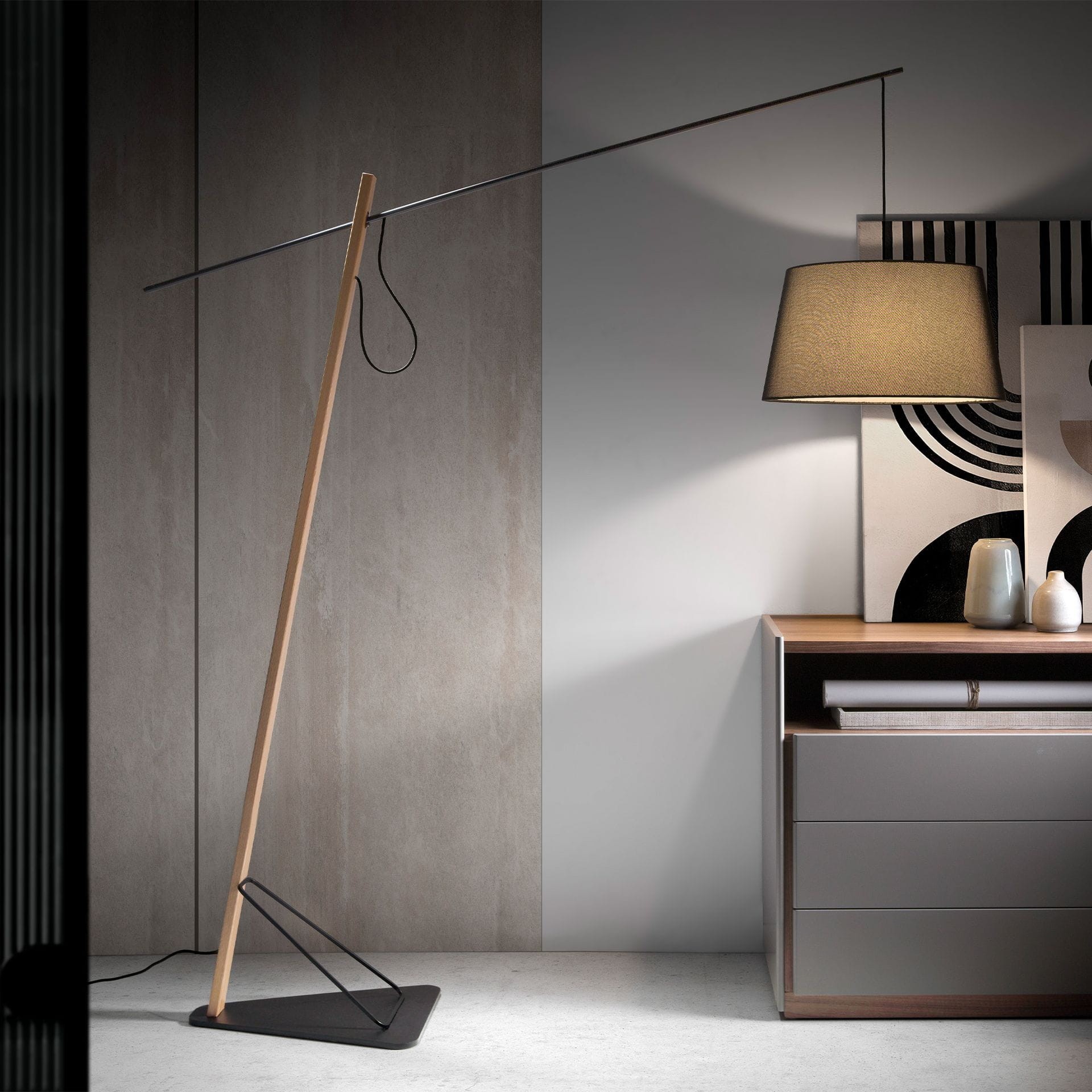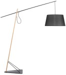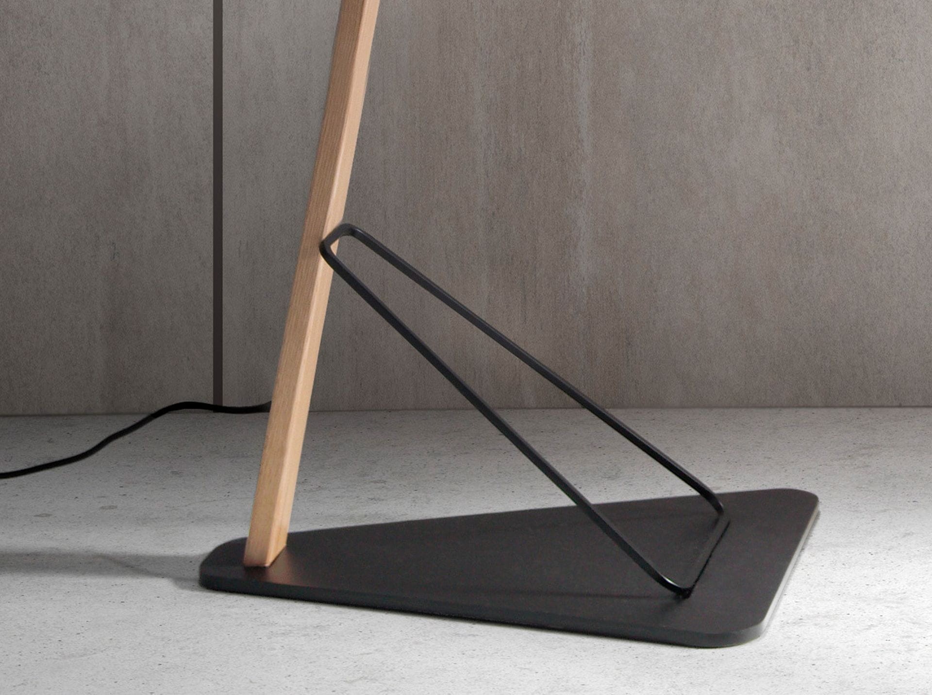 Lampa podłogowa z abażurem z tkaniny i możliwością regulacji odległości. Podstawa i ramie wykonane z drewna fornirowanego dębem i czarnej stali nierdzewnej.