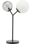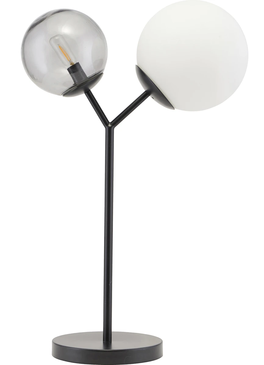 Geometryczna gra światła i cienia w nowoczesnej, graficznej oprawie. Dwie kuliste formy — jedna z mlecznobiałego szkła, druga przezroczysta niczym kropla szkła — spoczywają na ramionach smukłego, czarnego stelaża w kształcie rozgałęzienia. Kontrast pomiędzy kloszami nie tylko intryguje wizualnie, ale też różnicuje rodzaj światła: ciepłego i rozproszonego z jednej strony, z drugiej — czystego i precyzyjnego. Czarna podstawa i stelaż nadają lampie graficzny, współczesny charakter. To projekt o przemyślanej lekkości, który doskonale odnajdzie się w przestrzeniach nowoczesnych, minimalistycznych lub loftowych, dodając im elegancji i dynamiki. Lampa emanuje spokojem, ale nie brakuje jej wyrazu — idealna do wnętrz, gdzie design ma mówić formą, a nie słowem.