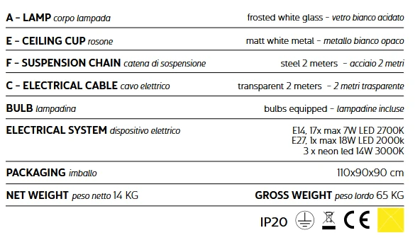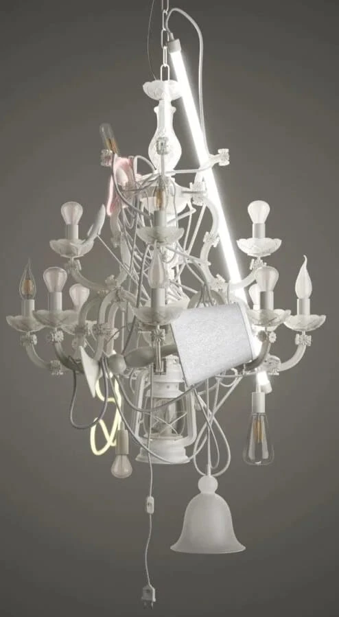 Jak w przypadku tajemniczej „istoty”, wszystkie klasyczne elementy są obecne — konstrukcja, ramiona, źródła światła i przewód — a jednak całość wymyka się oczywistości. Marcantonio, balansując na granicy sztuki i designu, tworzy formę zdekonstruowaną, zaskakującą, powstałą z dialogu różnych epok, materiałów i estetyk. Z centralnej, metalowej struktury wyrastają ramiona z dmuchanego szkła Murano o mlecznym, matowym wykończeniu, przeplatające się z detalami z kryształu z Czech — rozetami i talerzykami, jakby przeniesionymi wprost z XVIII-wiecznej Wenecji. Wśród nich pojawiają się nieoczywiste „zawieszenia”: lampa gazowa, klasyczna lampka z tekstylnym abażurem, szklany klosz, elastyczne ramię czy neonowa świetlówka rodem z lat 80. Ten eklektyczny zbiór dopełniają drobne, zaskakujące akcenty — szklana ryba w ruchu i neonowe, różowe serce — jedyne wyraźne nuty koloru w tej kompozycji. Całość przypomina świetlną instalację, która nie tyle oświetla przestrzeń, co ją opowiada — pełną kontrastów, wspomnień i subtelnej ironii.