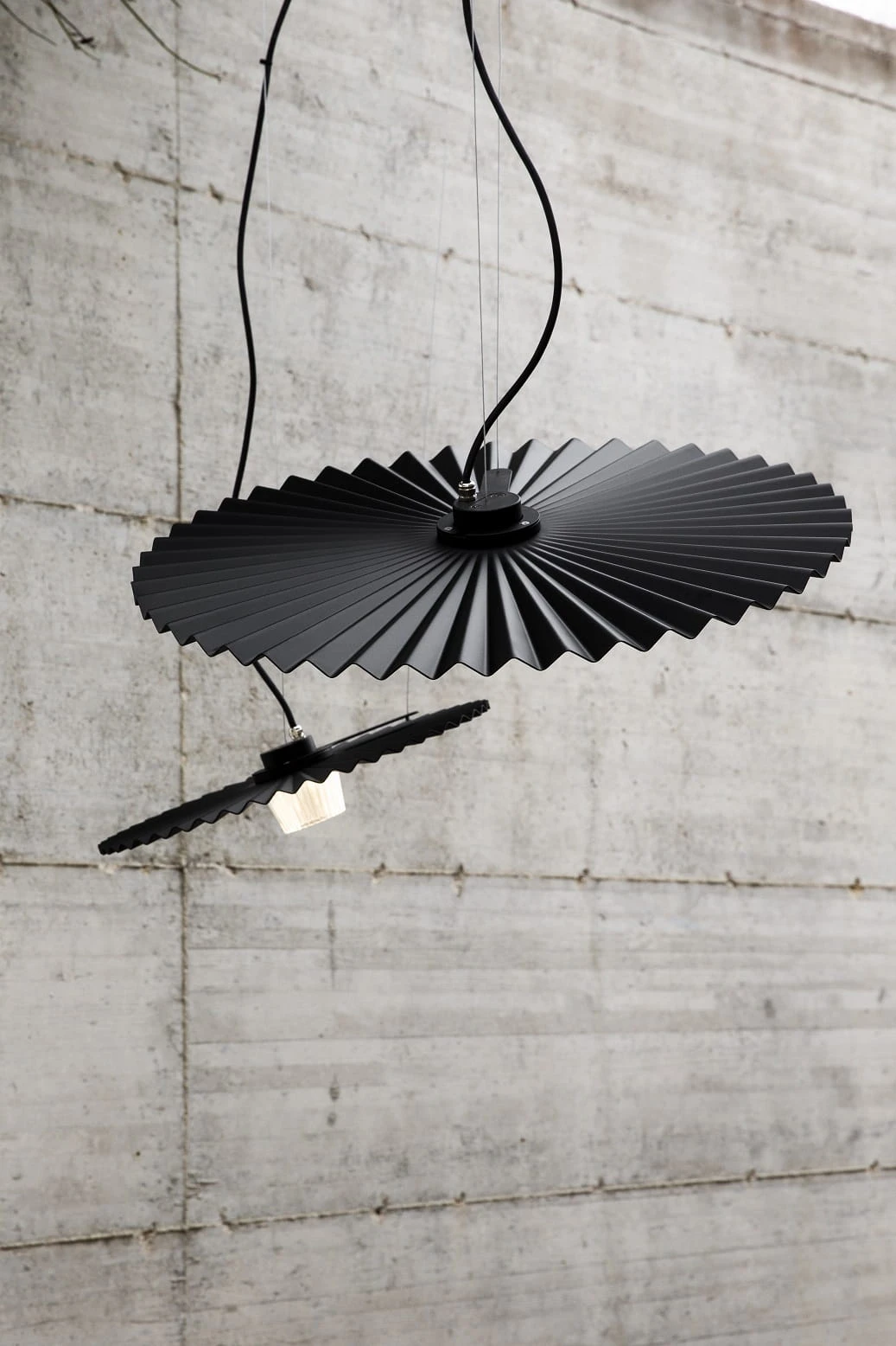 Gonzaga to lampa wisząca, w której prostota formy spotyka się z wyrazistą, niemal teatralną ekspresją. Inspirowana surową paletą barw, łączy matowe aluminium w odcieniach bieli, czerni i mosiądzu z delikatnie plisowaną strukturą, otulającą szklany, dmuchany dyfuzor. Jej sylwetka jest oszczędna, a jednocześnie pełna ruchu – dzięki stałemu mechanizmowi może być swobodnie ukierunkowana w przestrzeni, tworząc dynamiczną grę światła i cienia. To właśnie ten kontrast nadaje jej wyjątkowy charakter, jakby światło nieustannie przesuwało się po powierzchni, zmieniając atmosferę wnętrza. Dostępna w dwóch rozmiarach, odnajduje się zarówno we wnętrzach, jak i na zewnątrz – w przestrzeniach, które potrzebują subtelnego, ale wyrazistego akcentu.