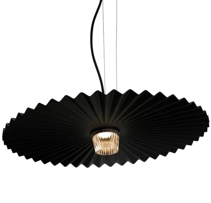 Gonzaga to lampa wisząca, w której prostota formy spotyka się z wyrazistą, niemal teatralną ekspresją. Inspirowana surową paletą barw, łączy matowe aluminium w odcieniach bieli, czerni i mosiądzu z delikatnie plisowaną strukturą, otulającą szklany, dmuchany dyfuzor. Jej sylwetka jest oszczędna, a jednocześnie pełna ruchu – dzięki stałemu mechanizmowi może być swobodnie ukierunkowana w przestrzeni, tworząc dynamiczną grę światła i cienia. To właśnie ten kontrast nadaje jej wyjątkowy charakter, jakby światło nieustannie przesuwało się po powierzchni, zmieniając atmosferę wnętrza. Dostępna w dwóch rozmiarach, odnajduje się zarówno we wnętrzach, jak i na zewnątrz – w przestrzeniach, które potrzebują subtelnego, ale wyrazistego akcentu.
