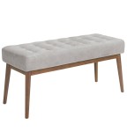 Ławka o nowoczesnym designie z siedziskiem obitym szarą tkaniną. Drewniane nogi w kolorze orzecha w awangardowym, a zarazem ponadczasowym stylu sprawią, że będzie to