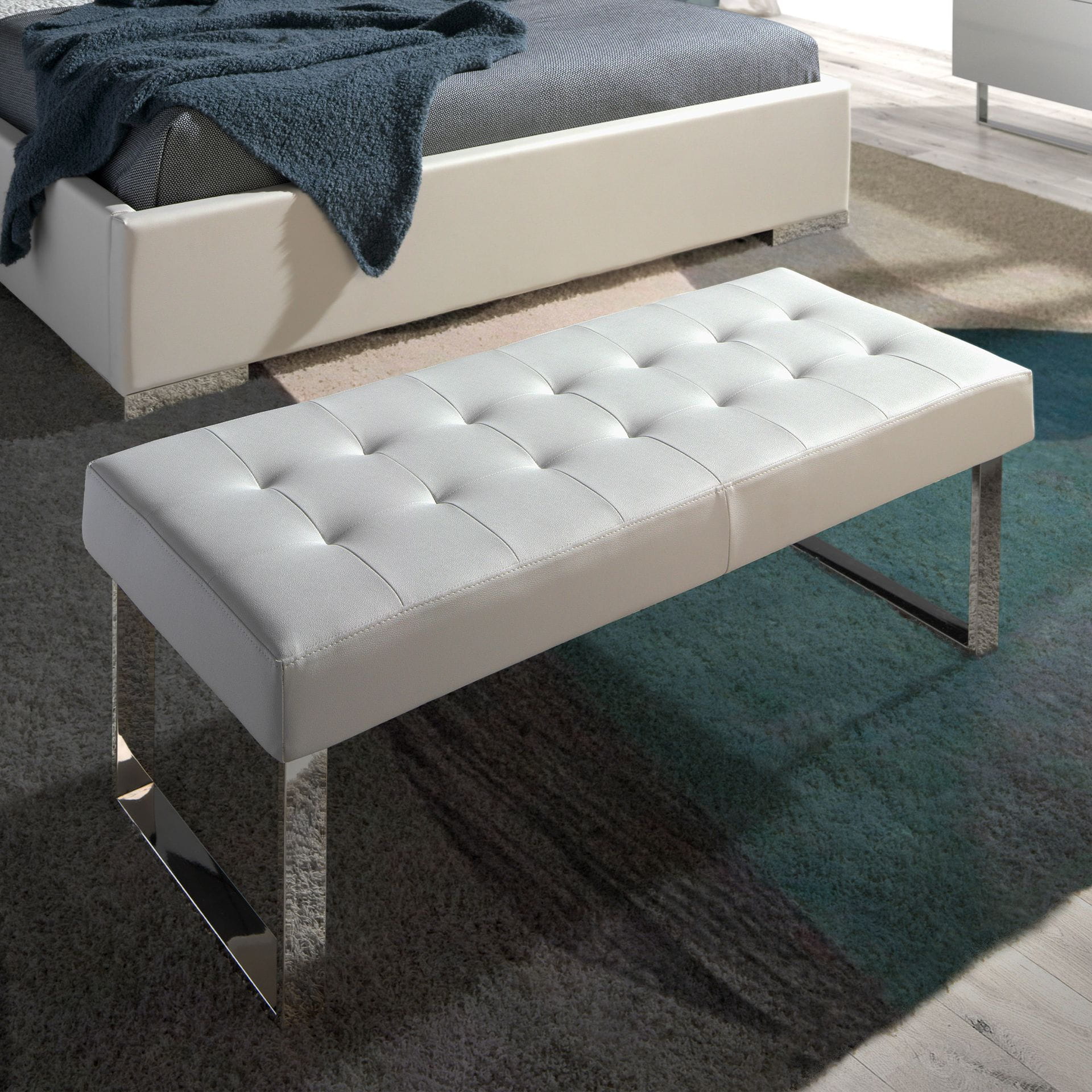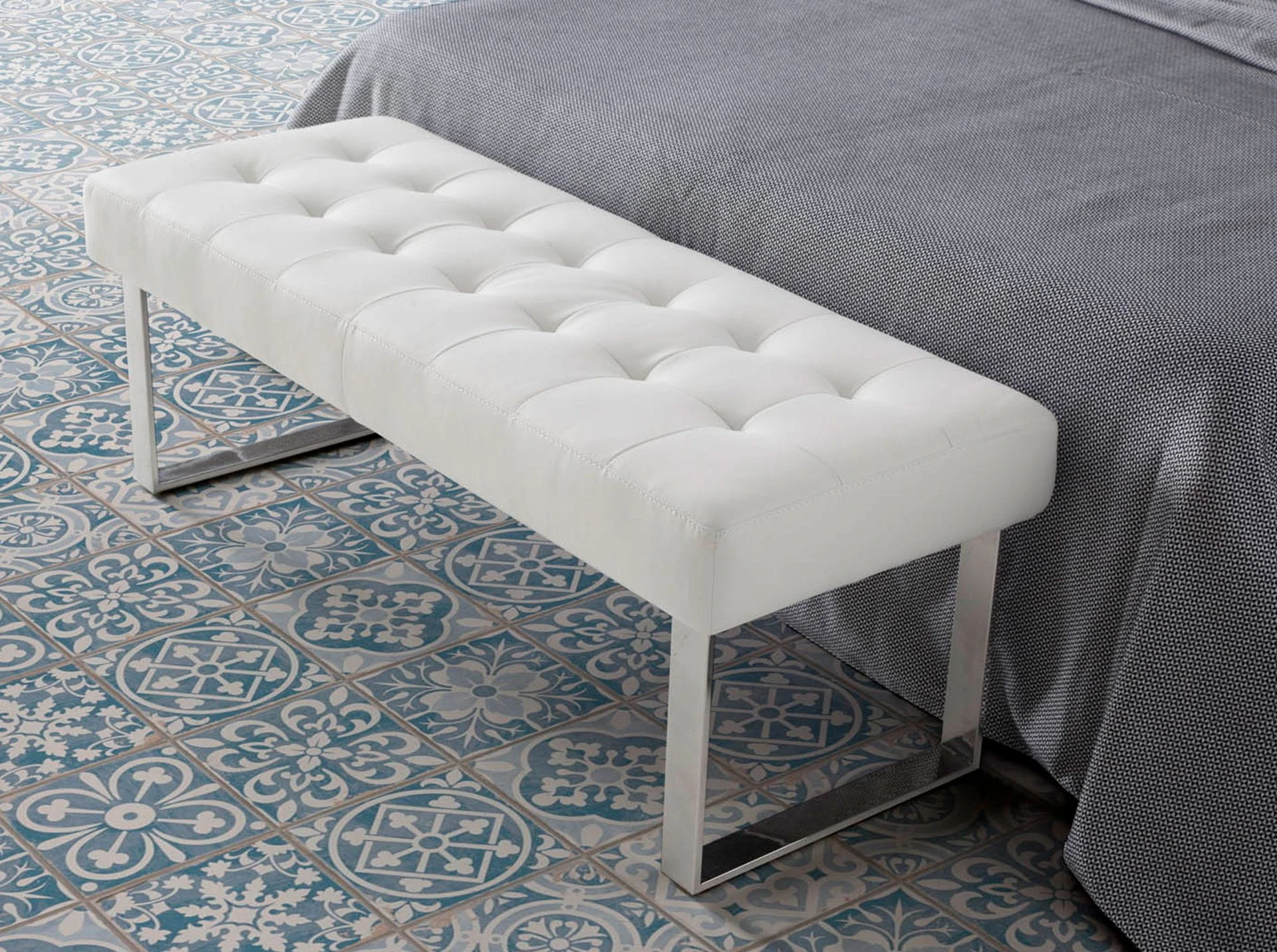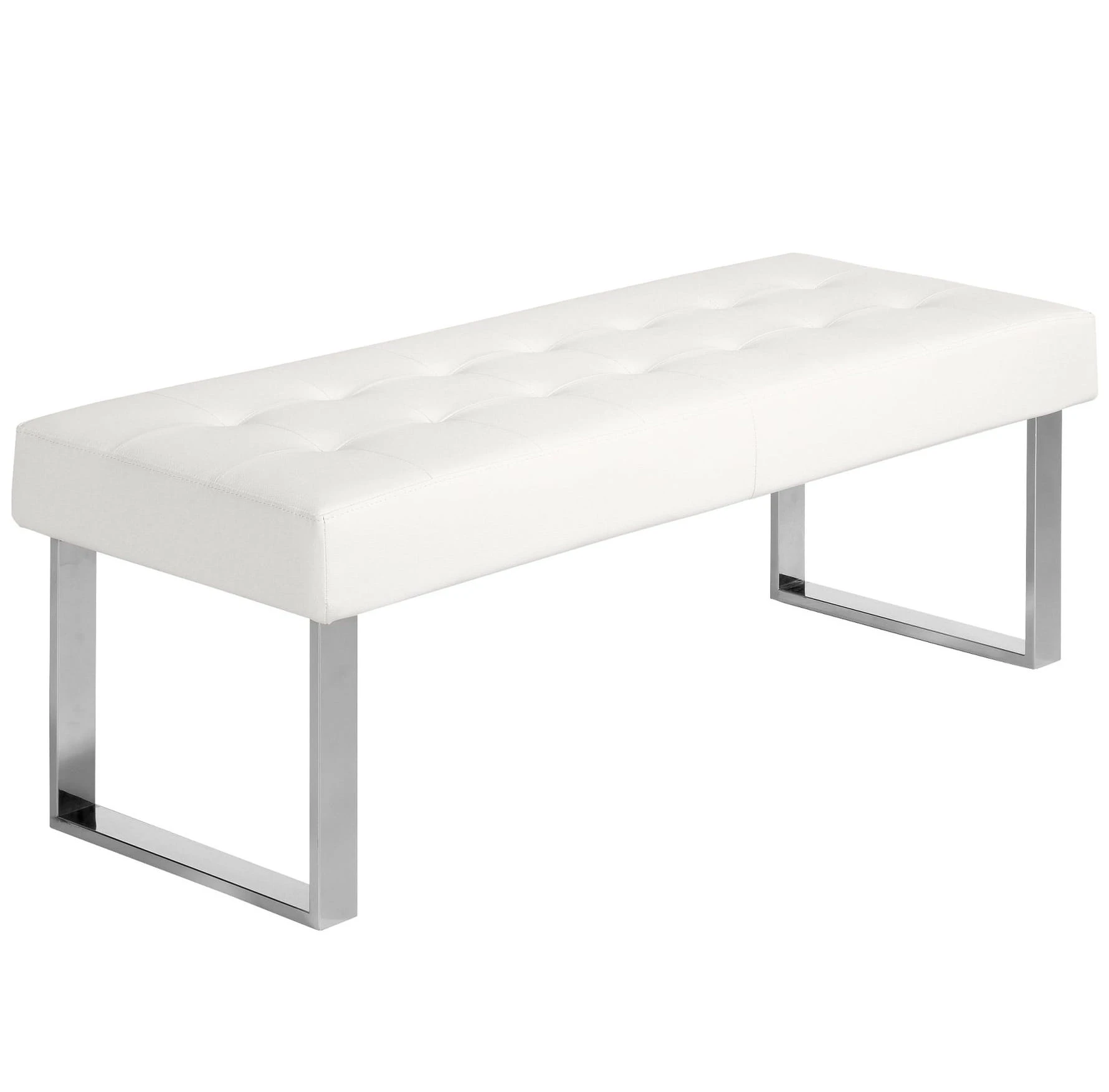 Nowoczesna ławka z siedziskiem obitym białą skórą ekologiczną. Jej chromowane nogi ze stali nierdzewnej o awangardowym, a zarazem ponadczasowym stylu sprawią, że będzie