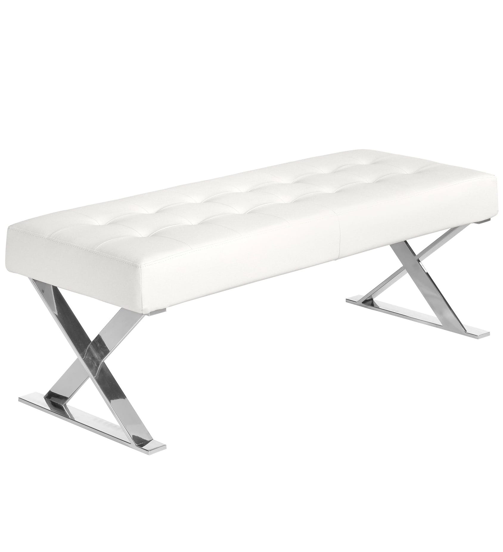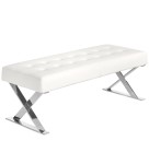 Nowoczesna ławka z siedziskiem obitym białą skórą ekologiczną. Jej chromowane nogi ze stali nierdzewnej o awangardowym, a zarazem ponadczasowym stylu sprawią, że będzie