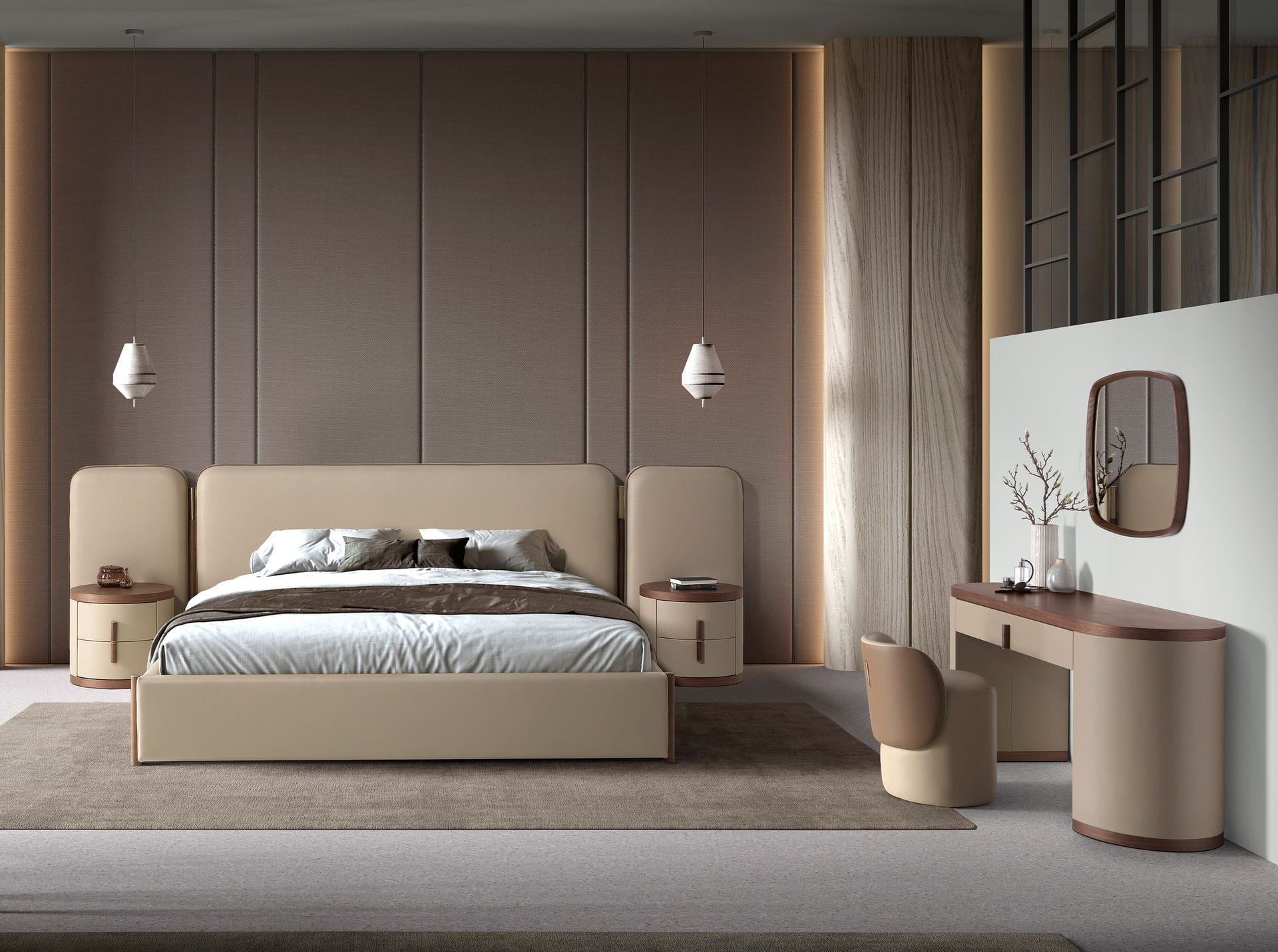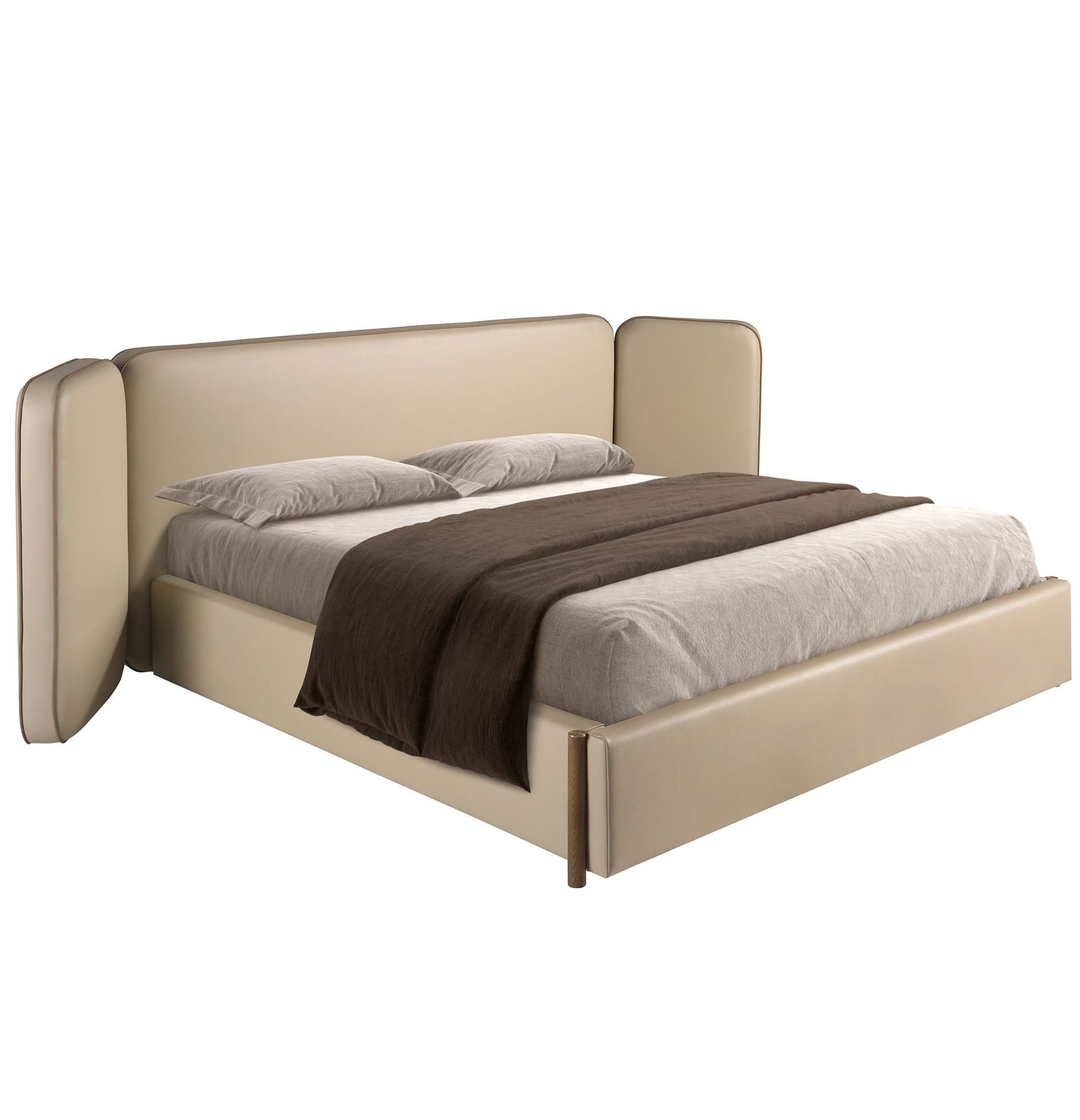 To łóżko emanuje spokojem, który kojarzy się z miękkim światłem poranka i ciszą tuż przed zaśnięciem. Jego bryła spowita jest w jasną, kremową tapicerkę, dzięki czemu całość wygląda, jakby otulała przestrzeń delikatnością. Najbardziej przyciąga wzrok szeroki, obły zagłówek, którego boczne skrzydła subtelnie się otwierają – niczym ramiona zapraszające do odpoczynku. Każdy element jest tu dopracowany z wyjątkową troską: od łagodnie zaokrąglonych krawędzi, po pionowe drewniane akcenty w narożnikach, które wprowadzają do kompozycji nutę naturalnego ciepła. To harmonijne połączenie miękkiej formy i solidnej konstrukcji – designu, który ma jednocześnie koić i wspierać. W takim łóżku sen staje się rytuałem, a sypialnia przestrzenią, w której łatwo znaleźć ukojenie. To mebel, który nie tyle wypełnia wnętrze, co tworzy jego atmosferę – spokojną, elegancką, pełną wyważonej prostoty.
