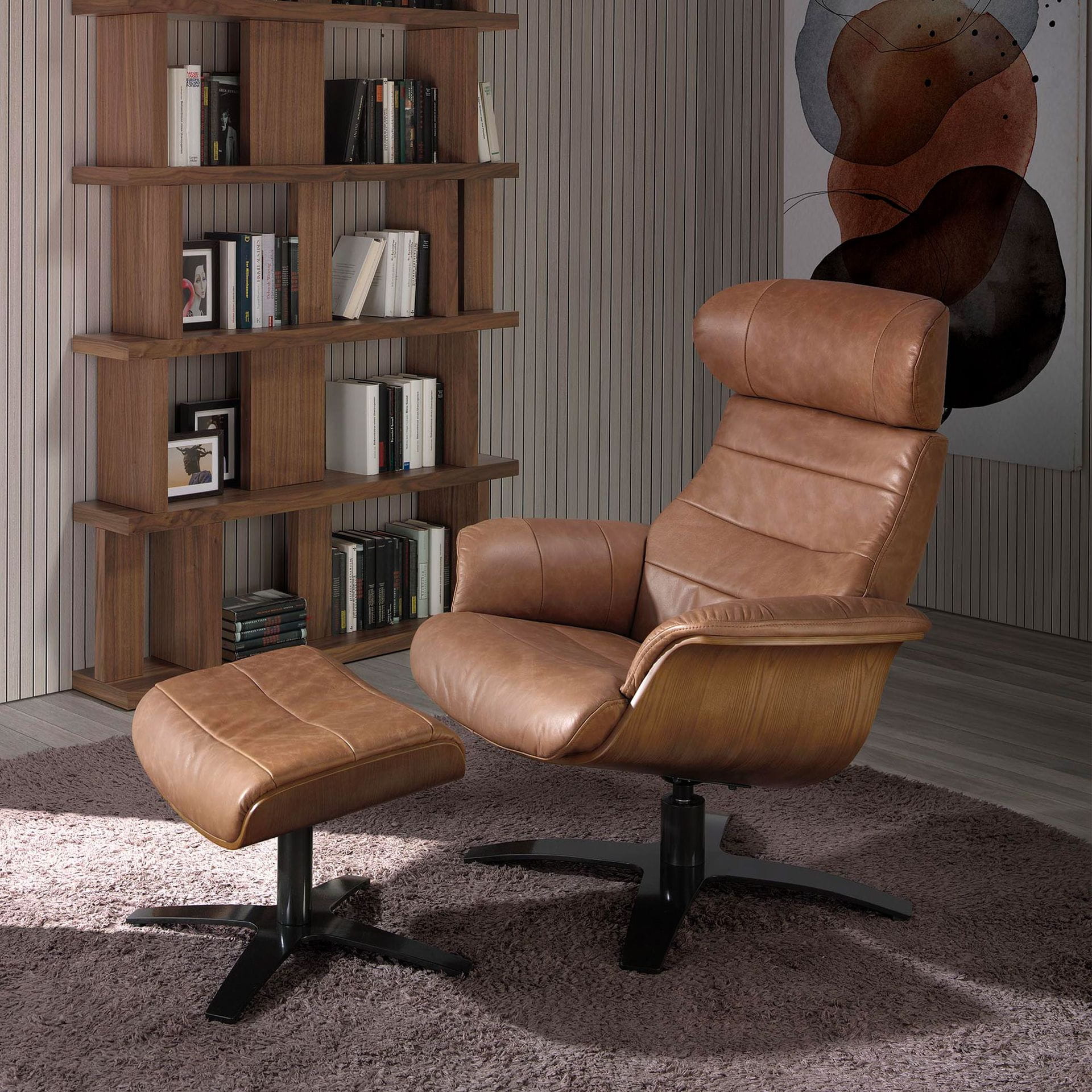 o delikatnie zaokrąglonym kształcie zachęca do odpoczynku, a naturalna faktura skóry dodaje całości ciepła i charakteru. Smukła, obrotowa podstawa
