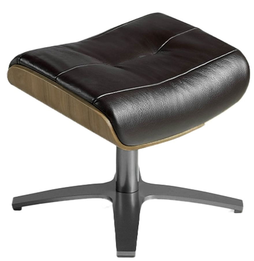 Nowoczesny puf o designie z siedziskiem obitym czekoladowo-brązową skórą bydlęcą. Zarówno orzechowe detale drewniane, jak i przyciemnione nogi ze stali nierdzewnej