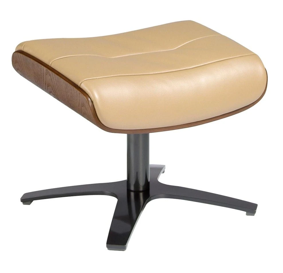 Nowoczesny puf o designie z siedziskiem obitym piaskową skórą bydlęcą. Zarówno orzechowe detale drewniane, jak i przyciemnione nogi ze stali nierdzewnej w awangardowym,