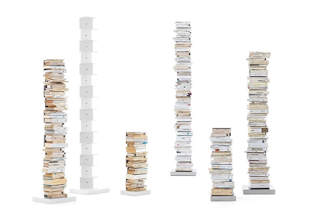 Original Ptolomeo to regał, który redefiniuje samą ideę przechowywania książek — forma ograniczona do absolutnego minimum, a jednocześnie koncepcja tak wyrazista, że stała się ikoną współczesnego designu. Smukła stalowa kolumna z subtelnymi półkami niemal znika pod ciężarem książek, pozwalając, by to one stały się głównym bohaterem kompozycji. Gdy regał wypełni się tomami, konstrukcja staje się niemal niewidoczna, a książki zdają się unosić pionowo w przestrzeni. Projekt autorstwa Bruno Rainaldiego, nagrodzony Compasso d’Oro w 2004 roku, powstał z obserwacji codziennych gestów i przekształca prosty stos książek w obiekt architektonicznej elegancji. Podpis projektanta umieszczony u podstawy podkreśla jego status dzieła designu — jednocześnie funkcjonalnego i rzeźbiarskiego. Dostępny w trzech wysokościach, regał opiera się na stabilnej podstawie ze stali nierdzewnej lub lakierowanej, dopasowanej kolorystycznie do konstrukcji. Niewielka powierzchnia, jaką zajmuje, pozwala umieścić go zarówno w klasycznych, jak i nowoczesnych wnętrzach, a różnorodne wykończenia — matowa czerń, połyskliwa biel, stal nierdzewna czy efekt cortenu — umożliwiają idealne dopasowanie do charakteru przestrzeni.